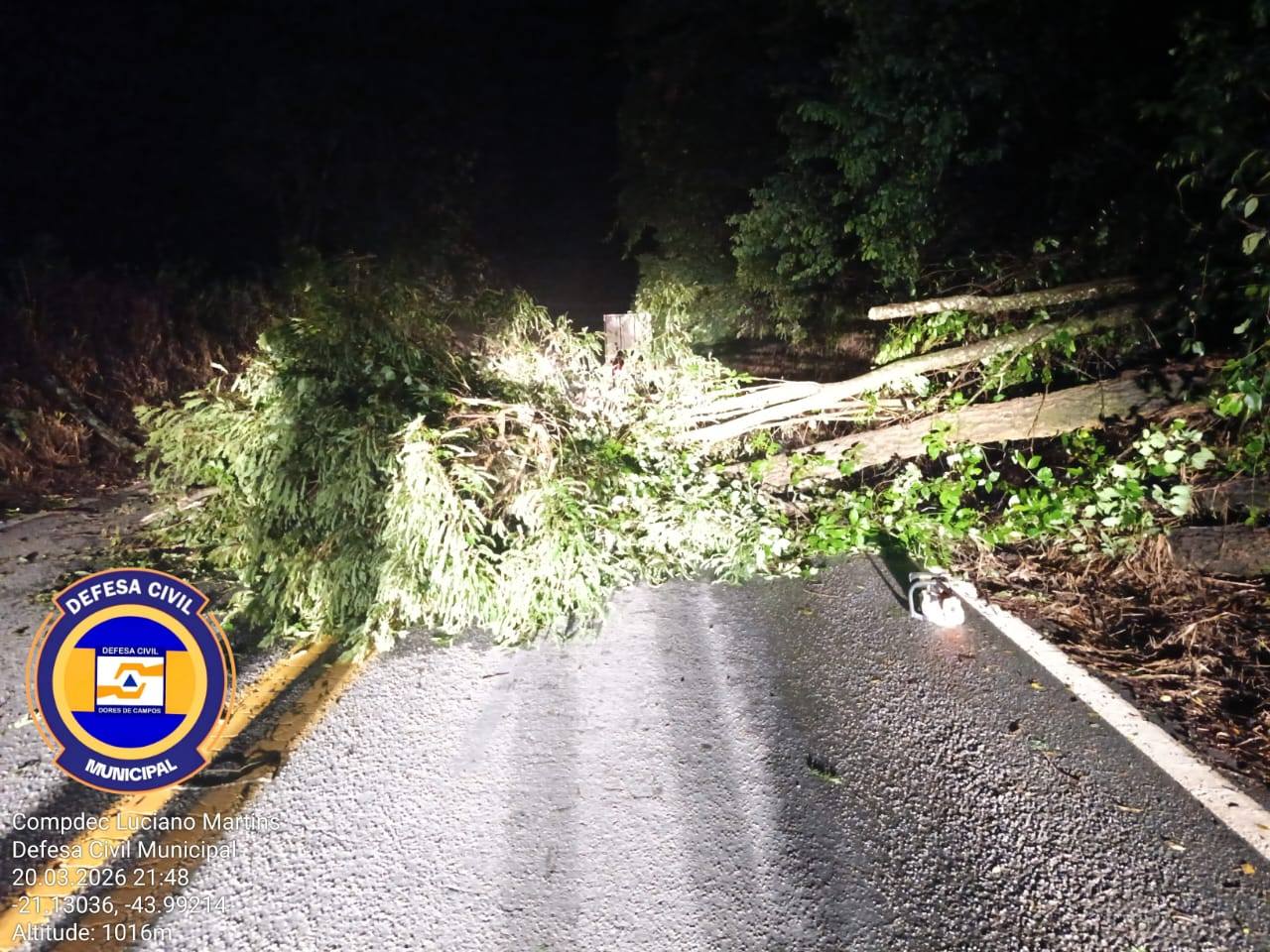 Na noite desta sexta-feira (20/03), a Polícia Militar acionou a Defesa Civil para a retirada de uma árvore que caiu na rodovia que liga os municípios de Dores de Campos e Barroso. A ocorrência mobilizou equipes no local para garantir a segurança dos motoristas e a liberação da via. O coordenador da Defesa Civil, Luciano Martins, acompanhou a ação ao lado do sargento Jorge e do sargento Lebourg.