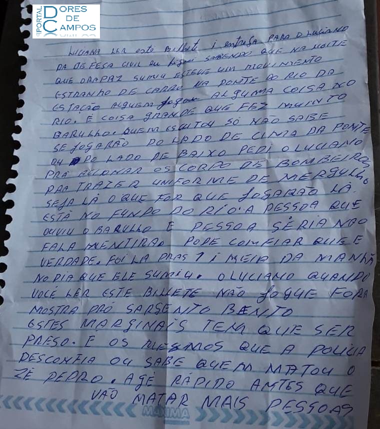 Com absoluta exclusividade, a nossa reportagem teve acesso a uma carta anônima enviada para a mãe do dorense André Filipe de Moura (25 anos) desaparecido há duas semanas, mais precisamente desde o dia 9 de agosto, quando foi visto pela última vez por volta das seis horas da tarde no bairro do Lourenço. O conteúdo desta carta, fez com que uma equipe de mergulhadores do Corpo de Bombeiros de São João Del Rei com o apoio da Polícia Militar de Dores de Campos se deslocasse até o Rio das Mortes nas proximidades da ponte da Estação de Prados, mas nada foi encontrado e desta forma, segue o drama da família. A carta anônima cita o nome do coordenador da Defesa Cicil, Luciano Martins, e também destaca que a provável morte do dorense André Flipe Moura teria sido cometida pelos mesmos suspeitos que teriam matado o comerciante José Pedro da Silva (55 anos), de forma covarde na madrugada do dia 21 de junho, na rodovia entre Dores de Campos e Prados, quando ele fazia a sua caminhada como de costume. “Acredito que tentaram desviar o foco. Continuamos as investigações, principalmente essa relação do sumiço do André e a morte do José Pedro”, destacou um policial que está trabalhando no caso. A carta termina com um alerta: “Vão matar mais pessoas”.