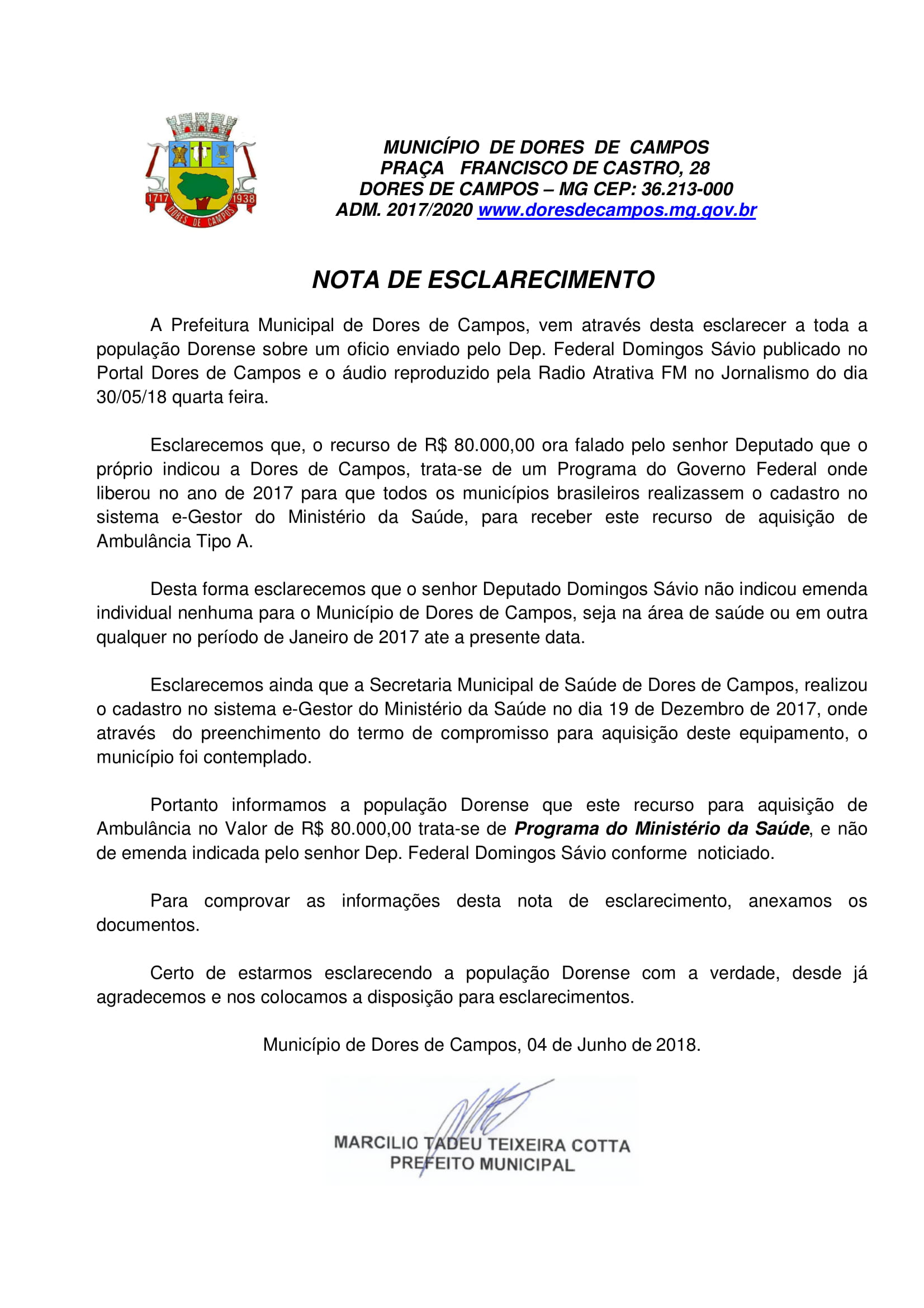 O prefeito Marcílio Cotta (MDB) enviou para a nossa reportagem nesta segunda-feira (04/06), uma Nota de Esclarecimento desmentindo o deputado federal Domingos Sávio (PSDB), que anunciou através de ofício no último dia 29 de maio, a liberação de um recurso articulado por ele, no valor de R$ 80 mil para que a Prefeitura pudesse comprar uma ambulância zero Km para a Secretaria Municipal de Saúde.