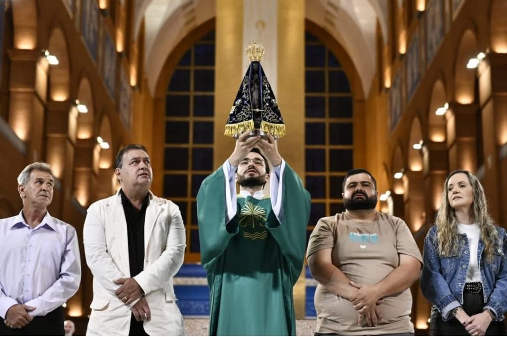 Em um momento marcado por fé e devoção, o diácono Pablo Moreira, que será ordenado padre em uma semana, esteve no Santuário Nacional de Aparecida acompanhado do prefeito Marcinho do Tica (MDB), do vice-prefeito Francisco do Andrade (Solidariedade) e de seus tios Edmar e Jordânia. A visita aconteceu diante da imagem peregrina de Nossa Senhora Aparecida, que estará em Dores de Campos nesta semana para uma série de celebrações.