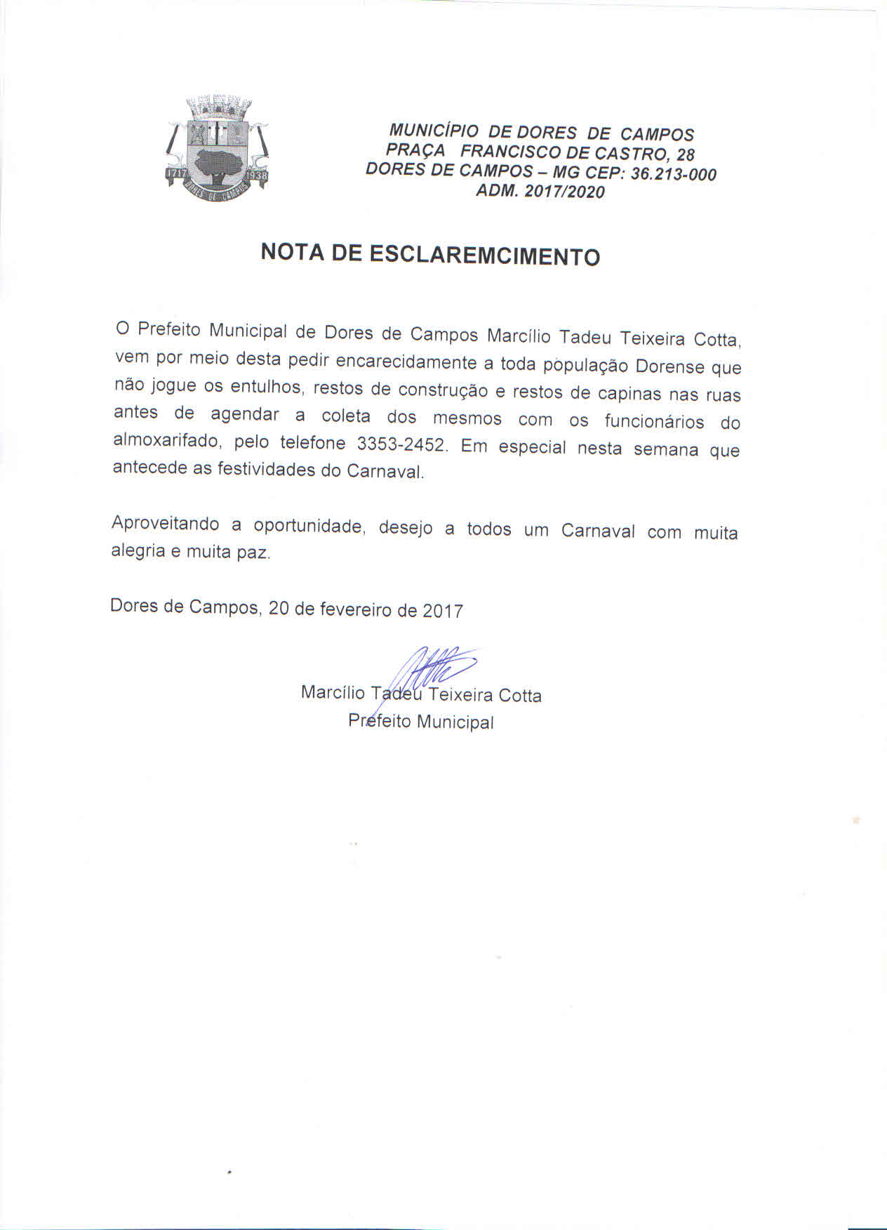 Diante dos festejos carnavalescos que se aproximam, a Prefeitura Municipal de Dores de Campos, através do prefeito Marcílio Cotta (PMDB), emitiu uma Nota de Esclarecimento, solicitando encarecidamente o apoio da população dorense, com relação ao planejamento da coleta de entulho. Na oportunidade, o prefeito voltou a disponibilizar o telefone (32) 3353 2452 do Almoxarifado Municipal, onde serão realizados os agendamentos.