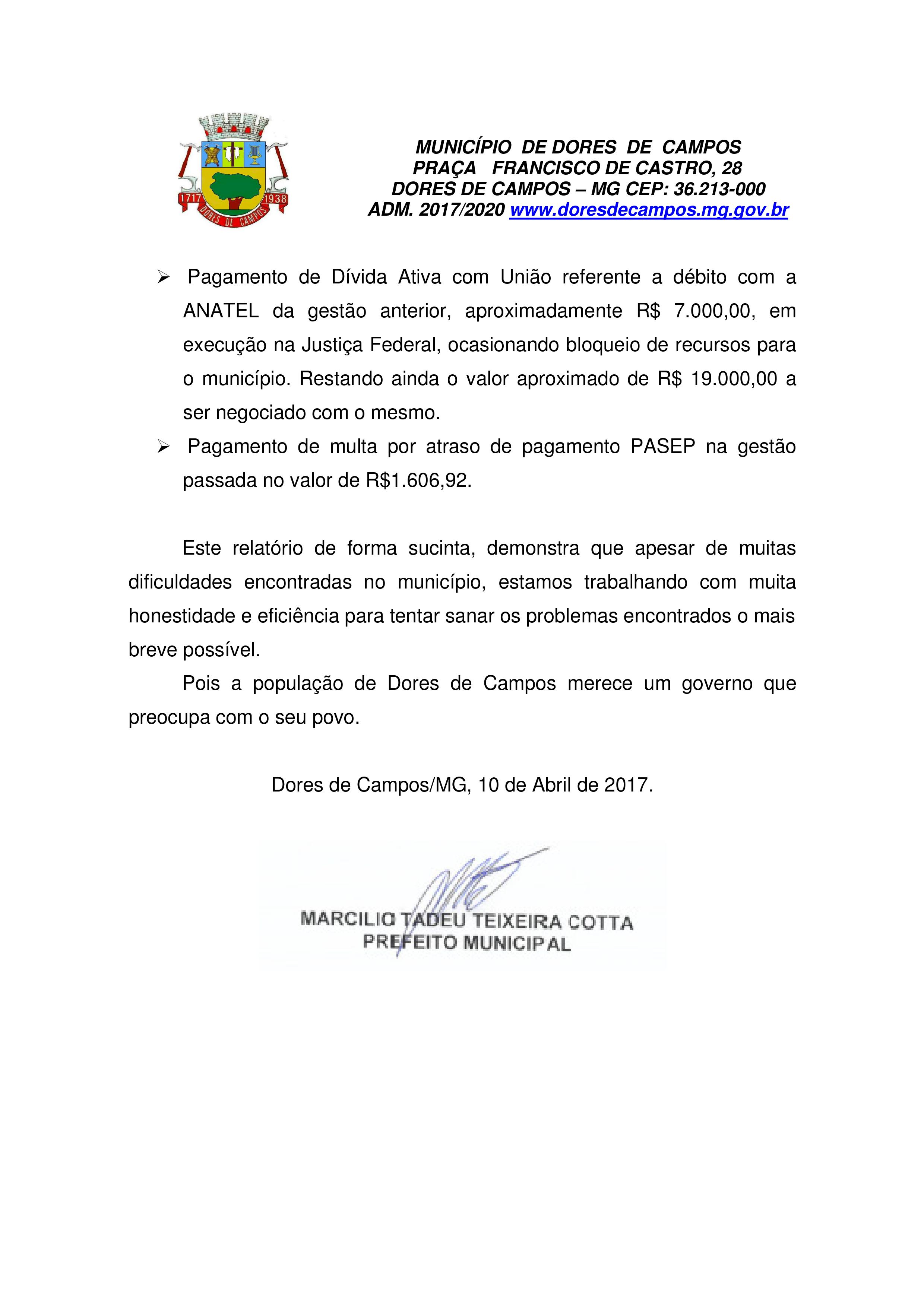 Nesta segunda-feira (10/04) a administração do prefeito Marcílio Cotta (PMDB) completou 100 dias de gestão. Diante desta data simbólica, a Prefeitura enviou um Relatório com todo o trabalho já realizado neste período, em praticamente todas as áreas. O documento é assinado pelo próprio prefeito.