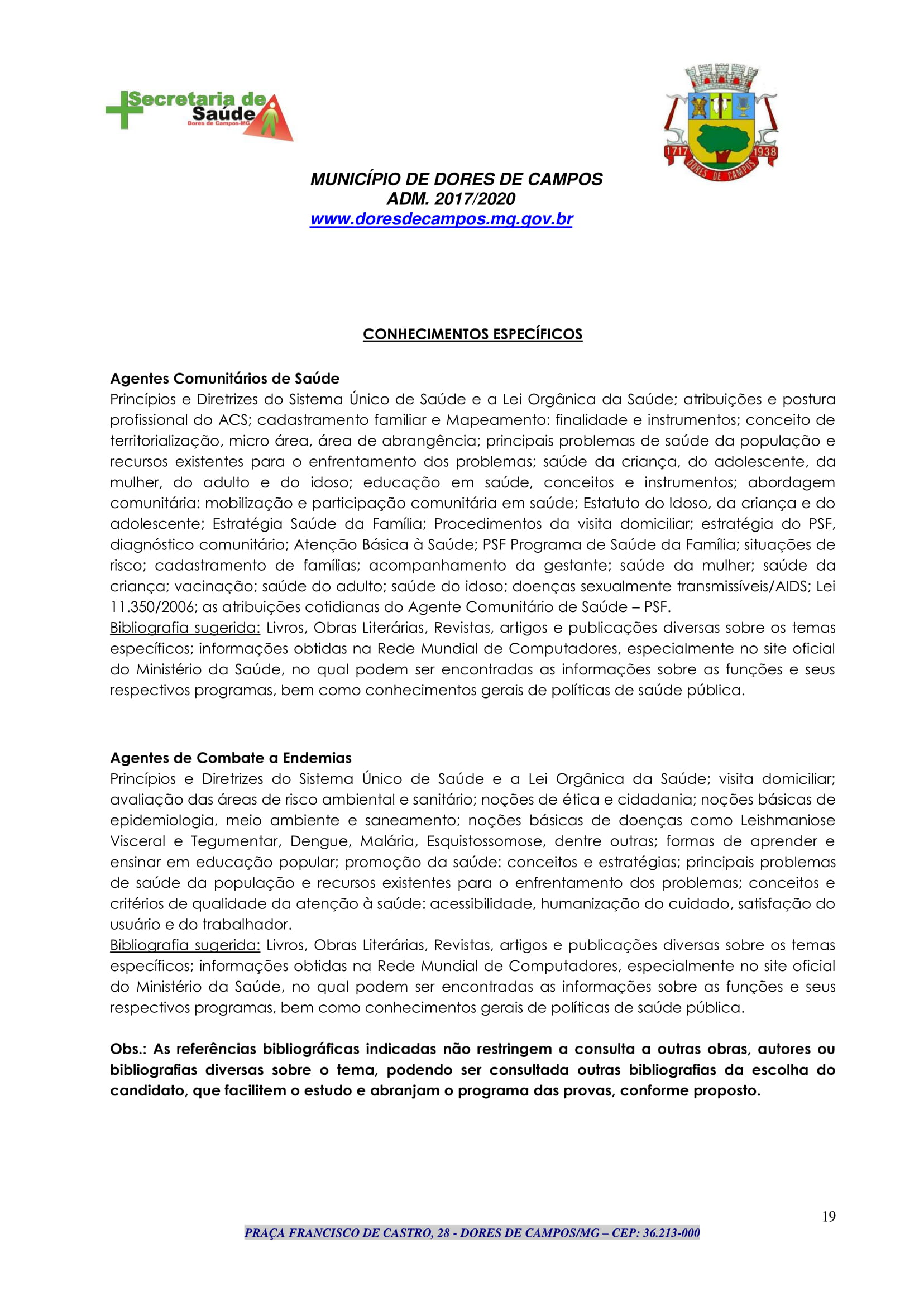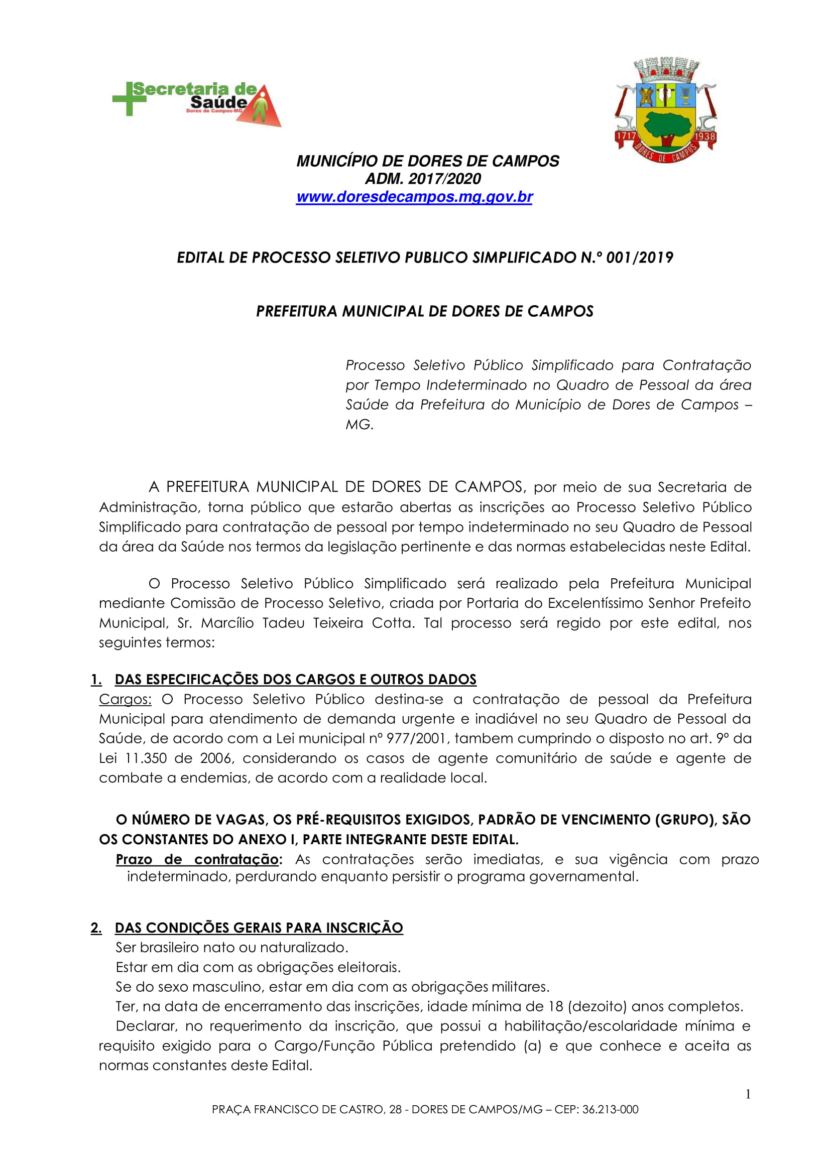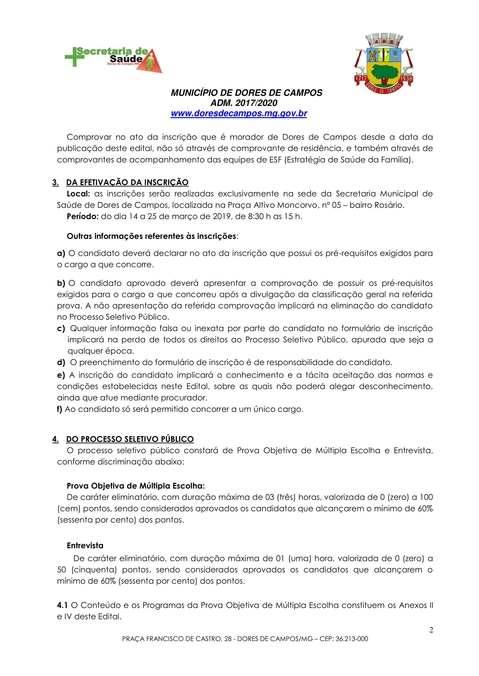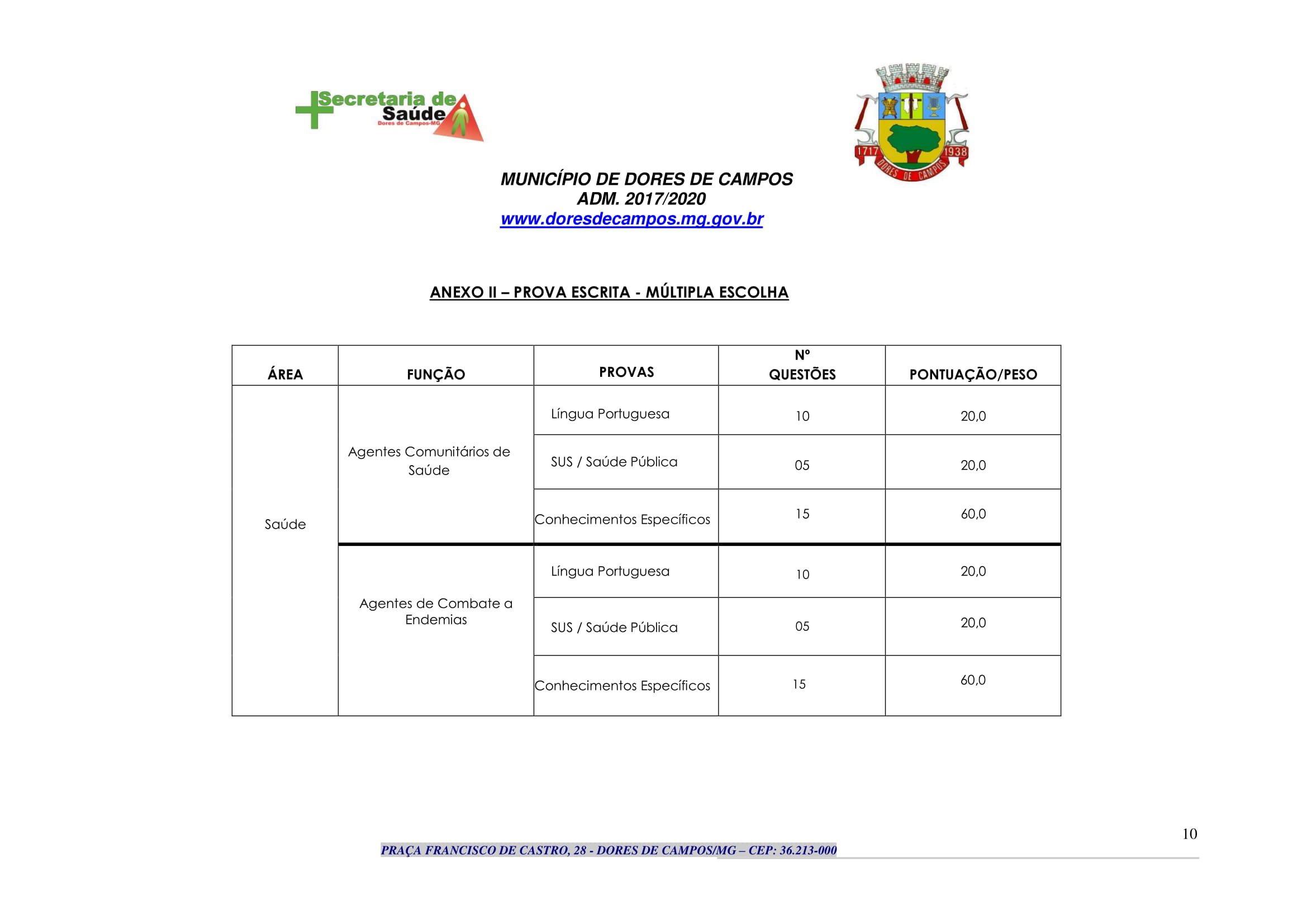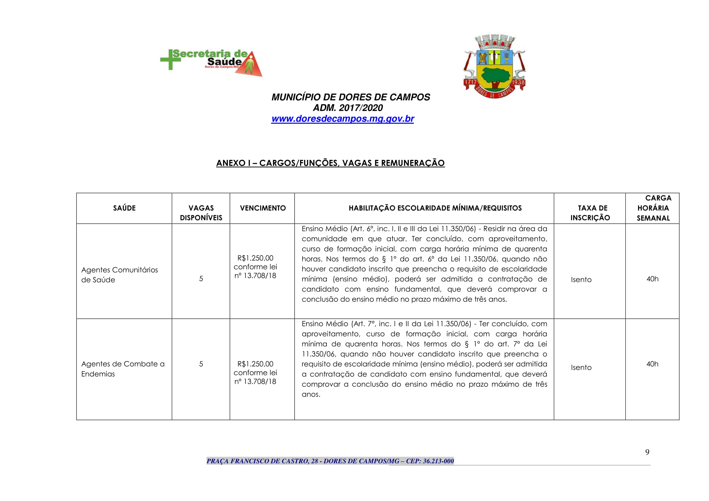 Conforme o Edital, as inscrições foram gratuitas e se inscreveram os candidatos que comprovadamente moram no município de Dores de Campos. O salário do Agente Comunitário de Saúde é de R$ 1.250,00 assim como o de Agente de Combate as Endemias que também é de R$ 1.250,00 para uma carga horária de 40 horas semanais. Leia (abaixo) o Edital completo e conheça todo o cronograma: