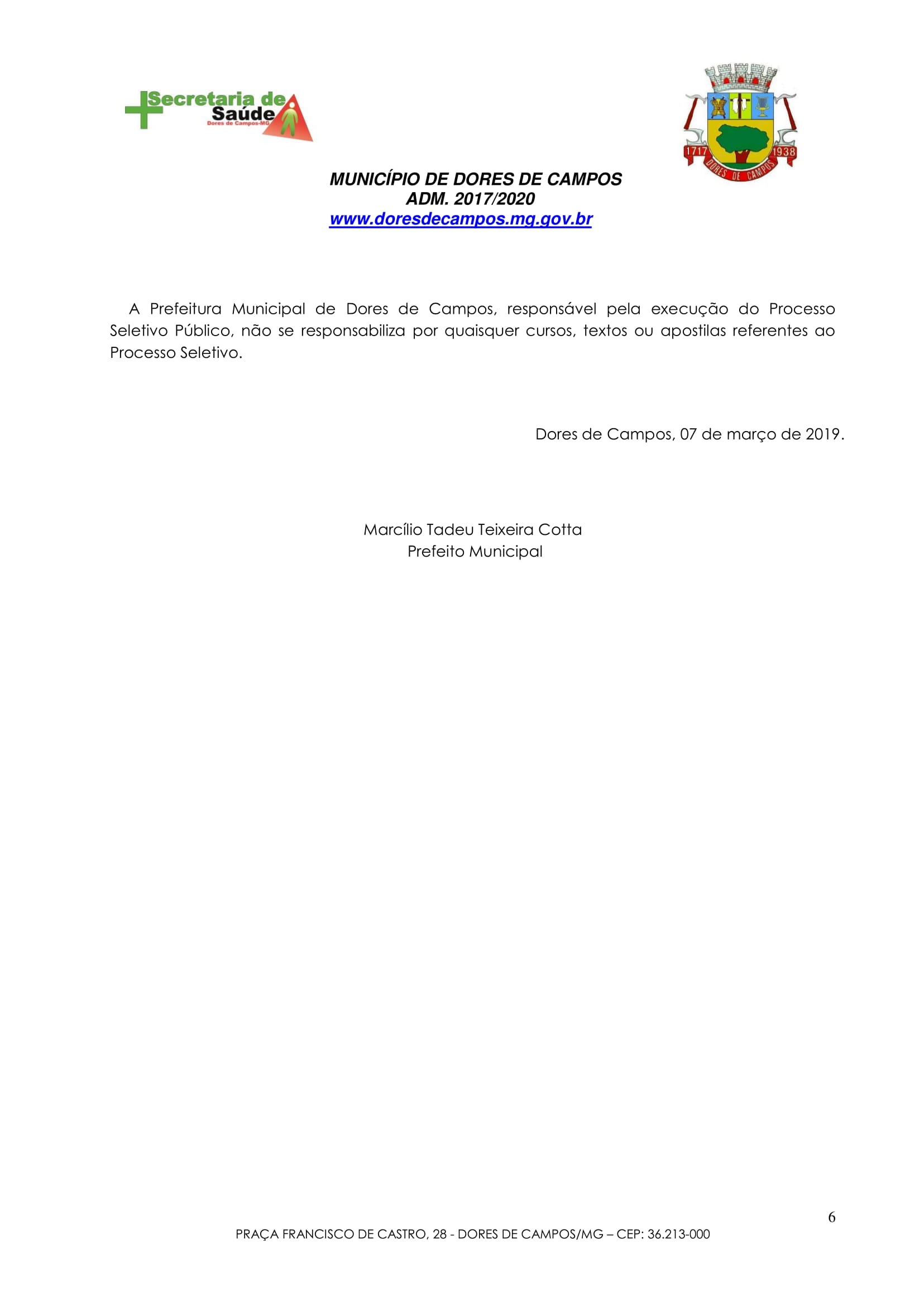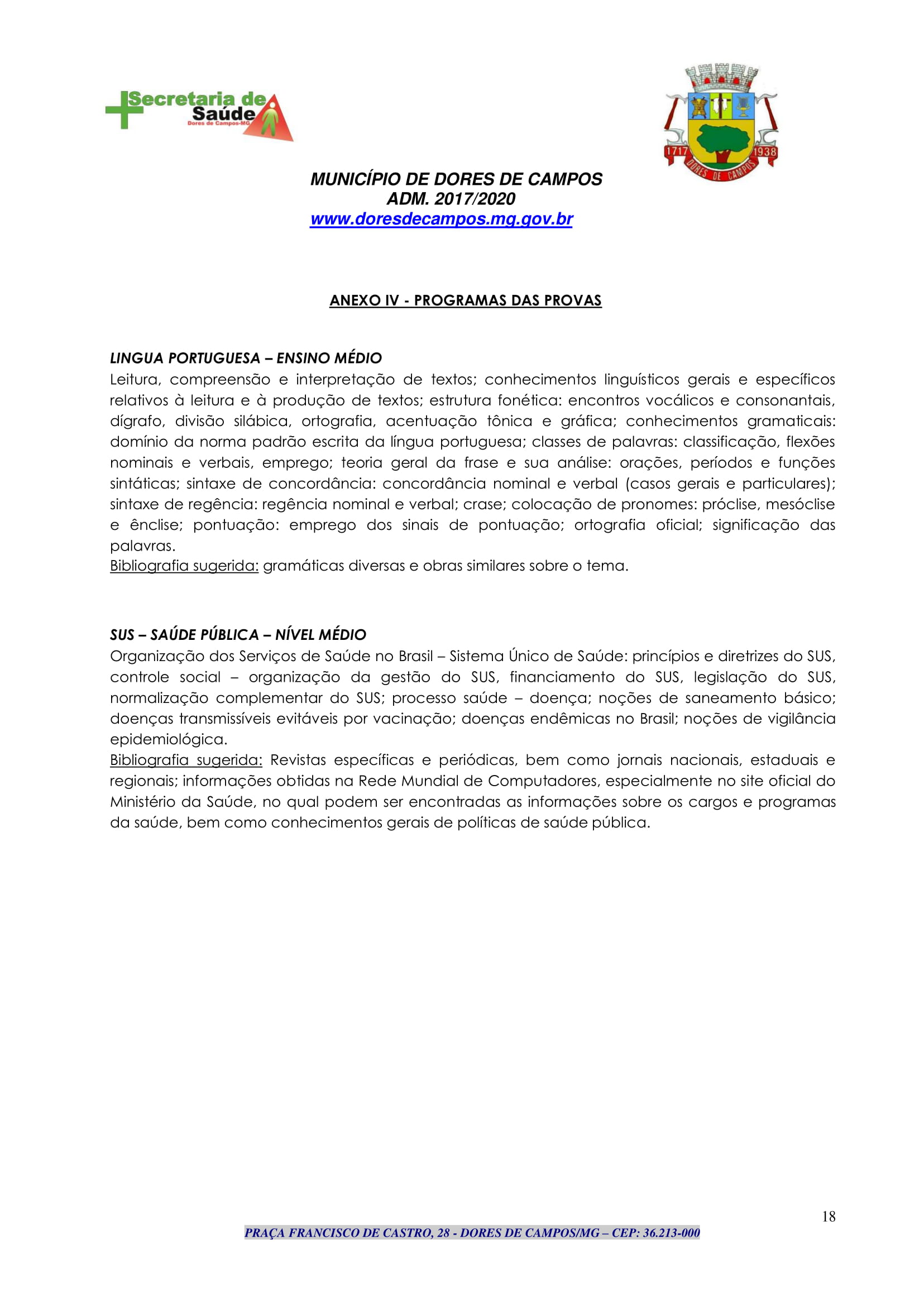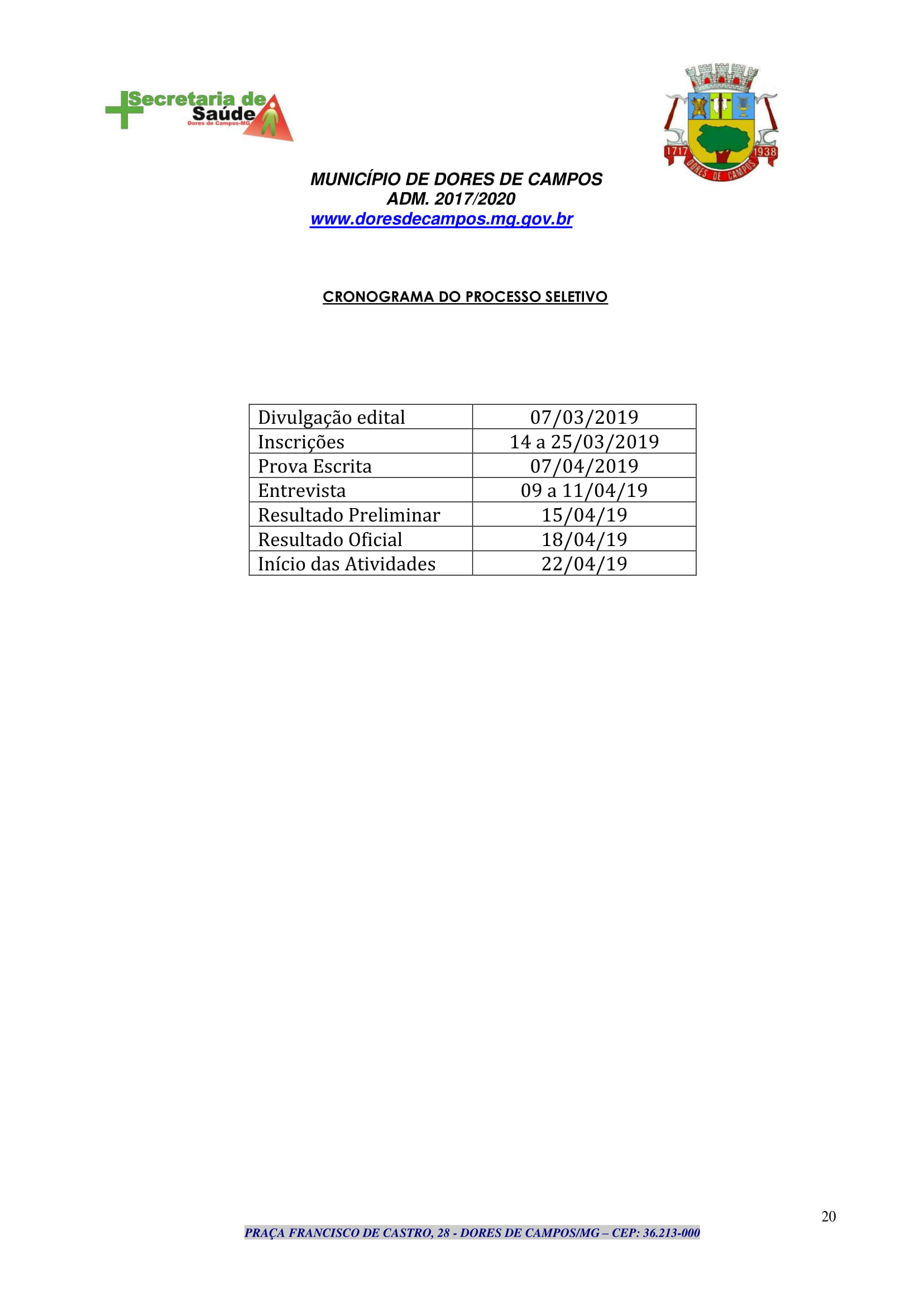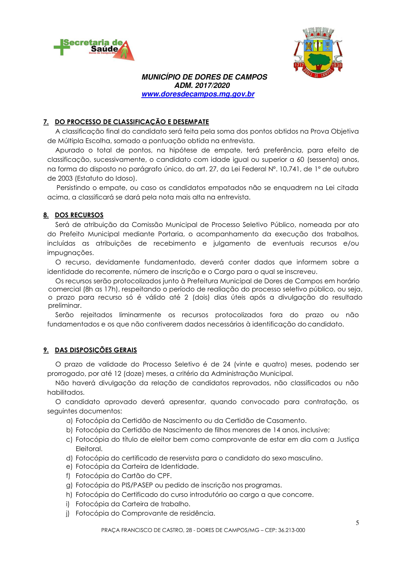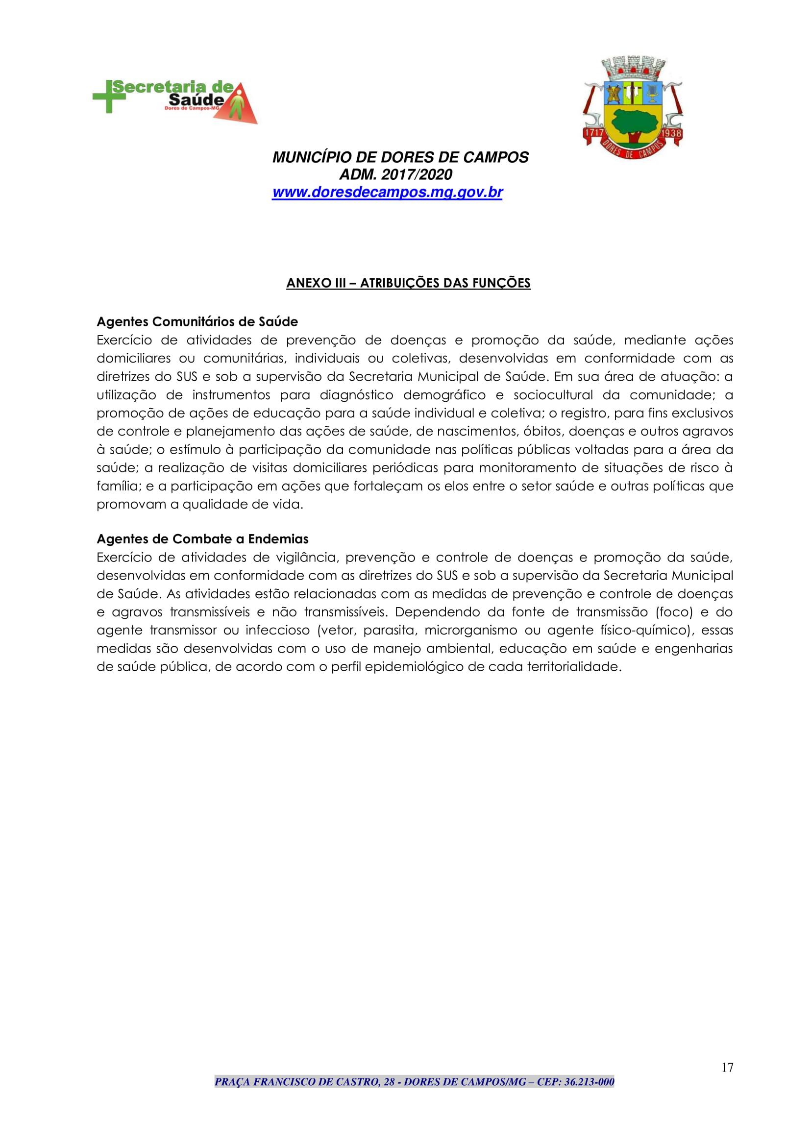 Conforme o Edital, as inscrições foram gratuitas e se inscreveram os candidatos que comprovadamente moram no município de Dores de Campos. O salário do Agente Comunitário de Saúde é de R$ 1.250,00 assim como o de Agente de Combate as Endemias que também é de R$ 1.250,00 para uma carga horária de 40 horas semanais. Leia (abaixo) o Edital completo e conheça todo o cronograma:
