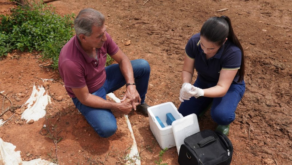 A vacinação é obrigatória em fêmeas bovinas de 3 a 8 meses de idade e deve ser realizada por médico veterinário habilitado, conforme determinação do Ministério da Agricultura e Pecuária (MAPA). Após a aplicação, as bezerras recebem uma marcação no lado esquerdo da face com o último dígito do ano, e o produtor recebe o Atestado de Vacinação contra Brucelose, documento que comprova a imunização. Durante as visitas, também foi realizado um exame de ultrassom em uma vaca para confirmação de gestação, a pedido de um produtor local, um exemplo prático do trabalho técnico e do apoio oferecido aos criadores do município.