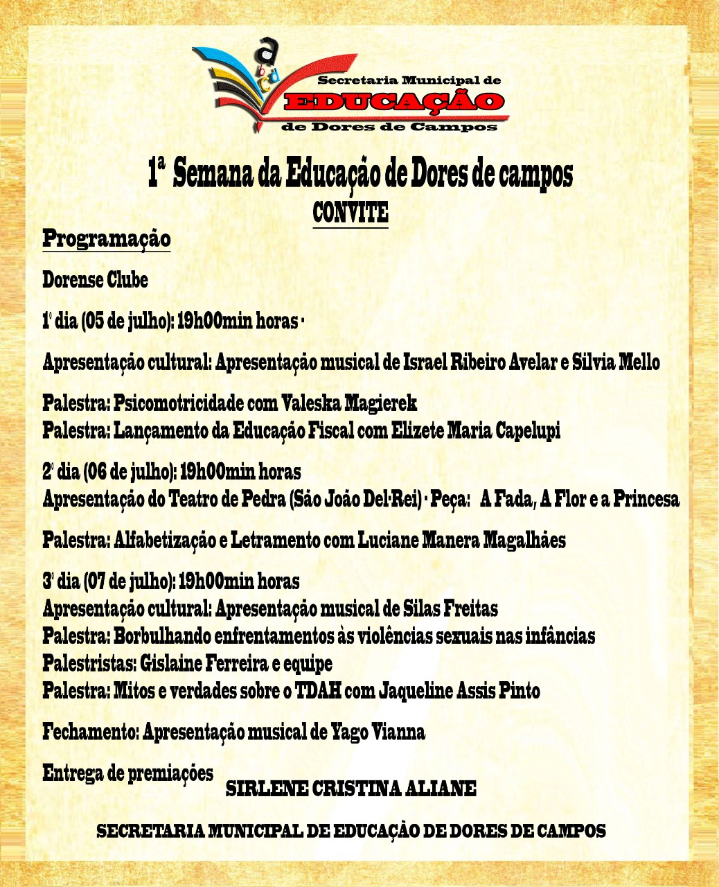 Foram três dias históricos em Dores de Campos, com grande participação popular e com debates que acrescentaram bastante no aprendizado de toda a comunidade escolar. Desta forma a primeira Semana Municipal de Educação, na sede social do Dorense Clube, organizada pela Prefeitura Municipal, através da Secretaria de Educação, trouxe reflexão e muita interatividade.