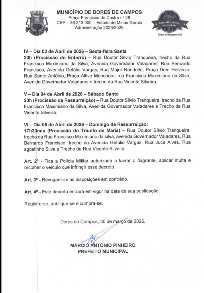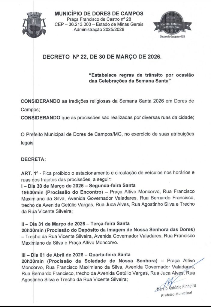 A Prefeitura Municipal de Dores de Campos publicou, nesta segunda-feira (30/03), o Decreto nº 22/2026, que estabelece regras específicas para a circulação e o estacionamento de veículos durante as celebrações da Semana Santa. A medida visa garantir a segurança dos fiéis e a organização das tradicionais procissões que percorrem as ruas da cidade.