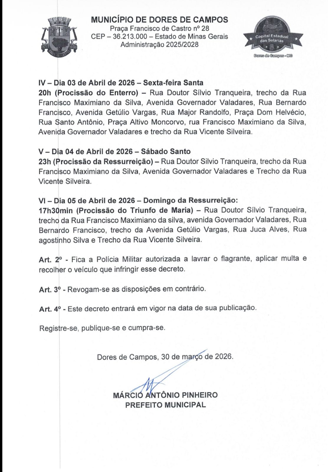 A Prefeitura Municipal de Dores de Campos publicou, nesta segunda-feira (30/03), o Decreto nº 22/2026, que estabelece regras específicas para a circulação e o estacionamento de veículos durante as celebrações da Semana Santa. A medida visa garantir a segurança dos fiéis e a organização das tradicionais procissões que percorrem as ruas da cidade.