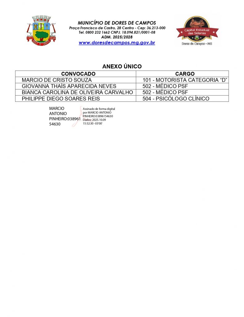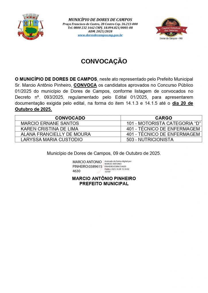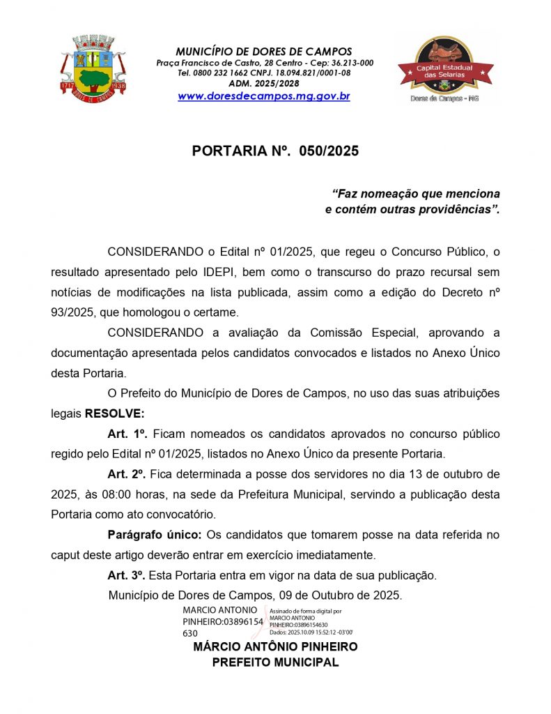 A Prefeitura Municipal de Dores de Campos publicou, nesta quinta-feira (09/10), a Portaria nº 050/2025, que nomeia novos candidatos aprovados no Concurso Público regido pelo Edital nº 01/2025. A medida foi assinada pelo prefeito Márcio Antônio Pinheiro e oficializa a posse de quatro novos servidores municipais.