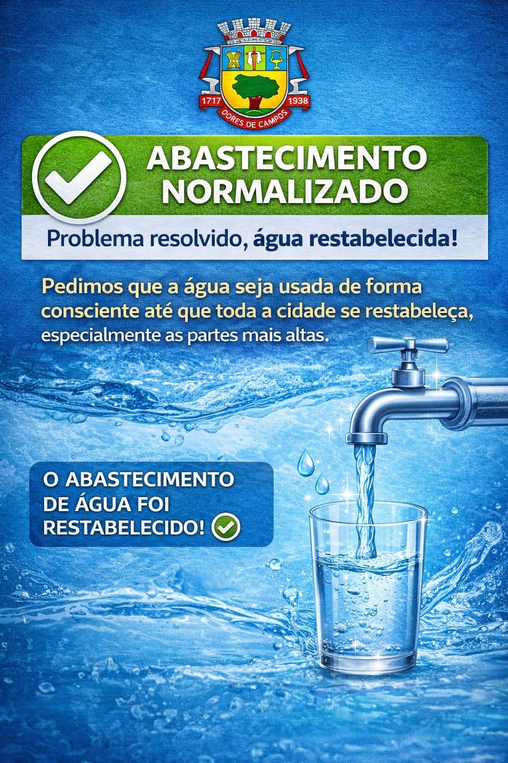 A Prefeitura Municipal de Dores de Campos informou que o problema na bomba de captação de água foi totalmente solucionado. Durante os trabalhos de manutenção, a equipe técnica também identificou uma falha adicional na válvula de abastecimento da captação, que igualmente foi corrigida. De acordo com a administração municipal, o sistema já se encontra normalizado e o fornecimento de água está sendo restabelecido gradativamente em toda a cidade.