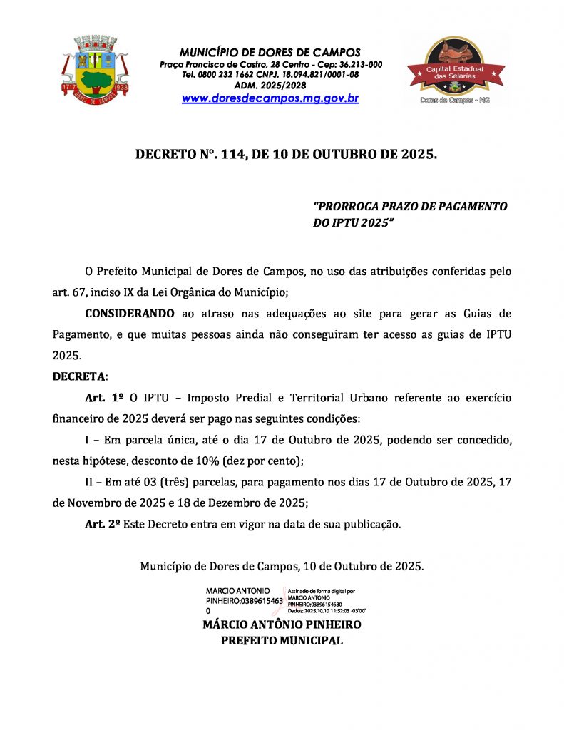A Prefeitura Municipal de Dores de Campos publicou o Decreto nº 114 prorrogando o prazo de pagamento do Imposto Predial e Territorial Urbano (IPTU) referente ao exercício financeiro de 2025. De acordo com o documento, a decisão foi tomada em razão de atrasos nas adequações do site oficial, o que impediu que muitos contribuintes tivessem acesso às guias de pagamento.