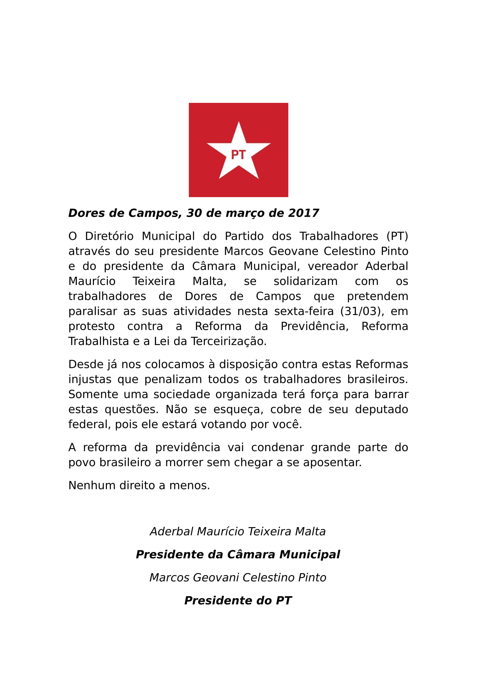 O presidente do PT de Dores de Campos, Marcos Geovane Celestino Pinto (Marquinhos) e o presidente da Câmara Municipal, vereador Bal do Carlos Heleno (PT), emitiram na manhã desta quinta-feira (30/03) uma Nota Oficial apoiando todos os trabalhadores que pretendem protestar nesta sexta-feira (31/03) contra as Reformas da Previdência e Trabalhista, além da Lei das Terceirizações, recentemente aprovada pela Câmara dos Deputados, em Brasília.