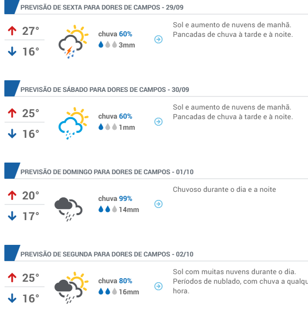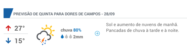 Será que vai chover mesmo? De acordo com o Instituto Clima Tempo, depois de uma longa estiagem, Dores de Campos terá chuva a partir da próxima quinta-feira (28/09) se estendendo até segunda-feira (02/10), em virtude de uma frente fria que está chegando ao Brasil.