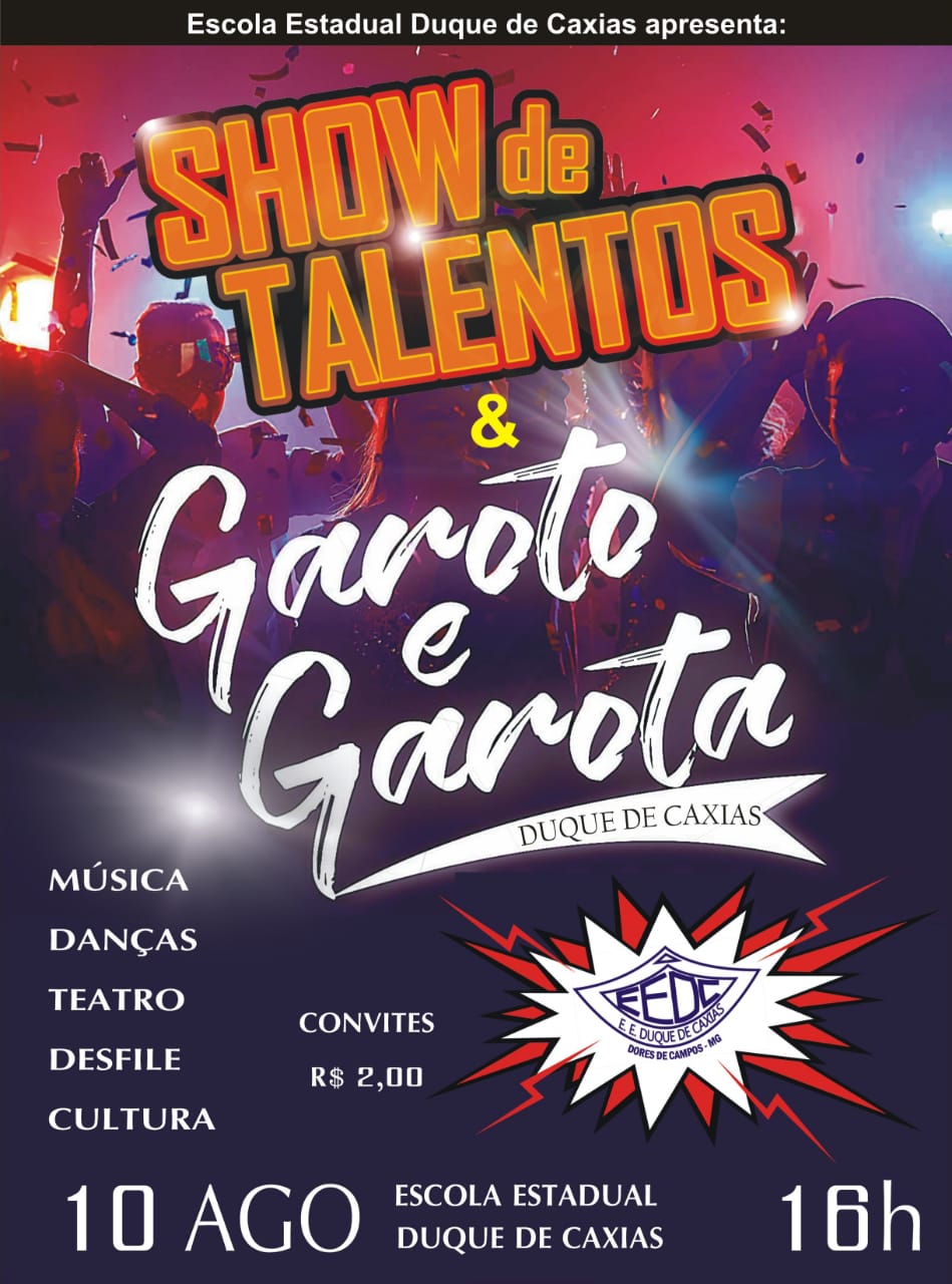 A Escola Estadual Duque de Caxias irá realizar no sábado (10) a partir das quatro horas da tarde, o 1⁰ Show de Talentos e o Concurso Garoto e Garota Duque de Caxias 2019. O evento é a primeira ação do Projeto de Lideranças Estudantis desenvolvido pela Secretaria de Estado de Educação (SEE) do Governo de Minas Gerais. A coordenação do projeto é do professor de Geografia, Evandro Freitas.