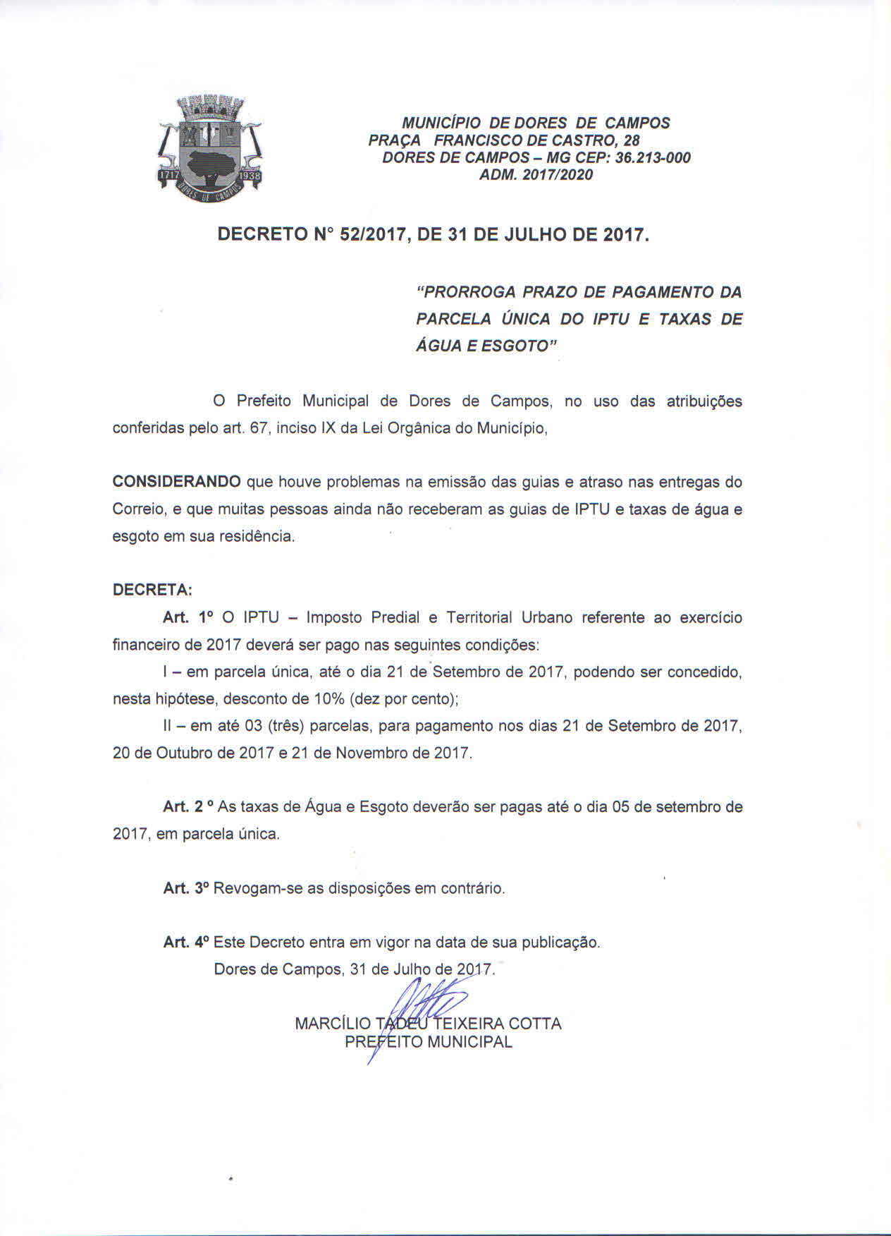 A Prefeitura Municipal de Dores de Campos, através do Decreto de número 52/2017, assinado pelo prefeito Marcílio Cotta (PMDB), prorrogou o prazo de pagamento da parcela única do IPTU e das Taxas de Água e Esgoto. As taxas poderão ser quitadas até o próximo dia 5 de setembro (terça-feira). Já a parcela única do IPTU com desconto de 10% poderá ser paga até o dia 21 de setembro (quinta-feira). Para quem optar em fazer o pagamento parcelado, as datas são as seguintes: Primeira parcela dia 21 de setembro (quinta-feira), segunda parcela 20 de outubro (sexta-feira) e terceira parcela dia 21 de novembro (terça-feira).
