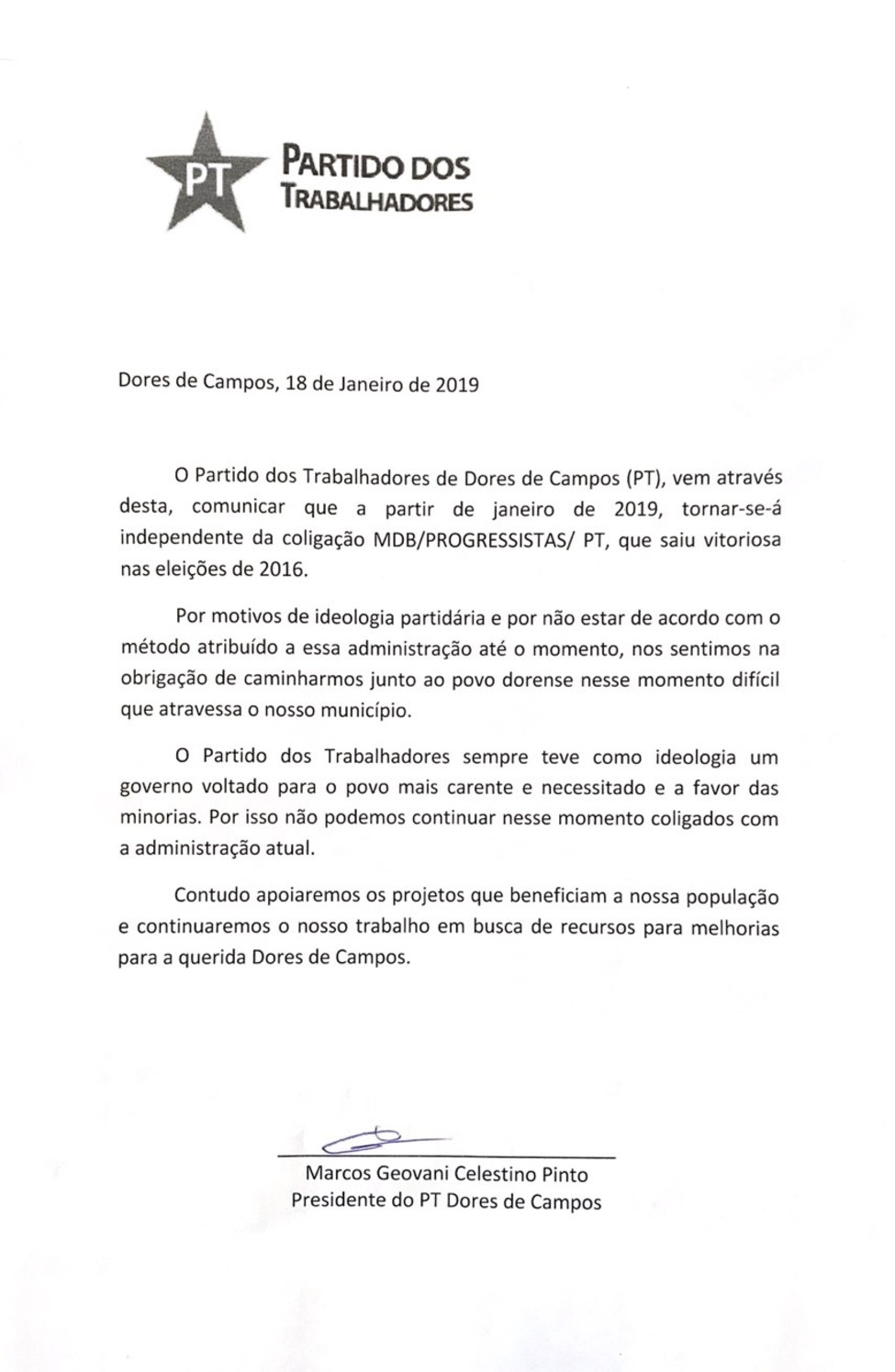 O presidente do Partido dos Trabalhadores (PT) de Dores de Campos, Marcos Geovane Celestino Pinto (Marquinhos), confirmou nesta sexta-feira (18/01), através de uma Nota Oficial, o rompimento do PT com o MDB e o Progressistas, “por não estar de acordo com o método atribuído a essa administração até o momento”. A Nota ainda destaca que o “Partido dos Trabalhadores (PT) sempre teve como ideologia um governo voltado para o povo mais carente e necessitado e a favor das minorias. Por isso não podemos continuar nesse momento coligados com a administração atual”. Ao final, a Nota enfatiza: “Contudo, apoiaremos os projetos que beneficiam a nossa população e continuaremos o nosso trabalho em busca de recursos para melhorias para a nossa querida Dores de Campos”.