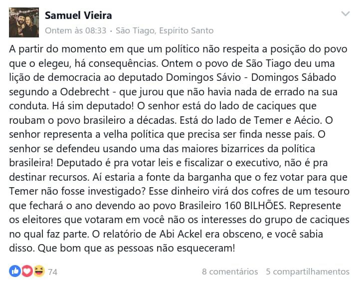 Veja uma postagem do santiaguense Samuel Vieira que está circulando pelas redes sociais, juntamente com um vídeo, retratando as vaias ao deputado federal Domingos Sávio (PSDB):