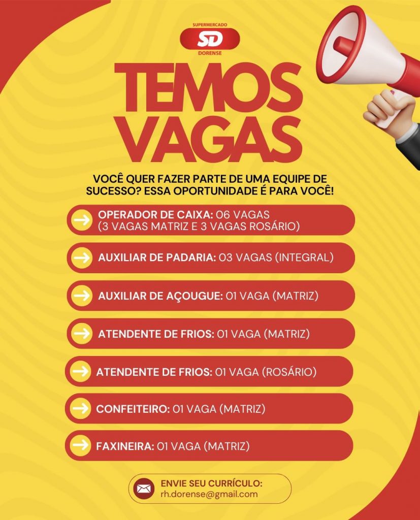 O Supermercado Dorense anunciou a abertura de 13 vagas de emprego para atuação na matriz e também na unidade do Rosário. As oportunidades contemplam diferentes setores da empresa e incluem cargos para contratação imediata. De acordo com o anúncio divulgado pela empresa, estão disponíveis seis vagas para operador de caixa, sendo três para a matriz e três para a unidade do Rosário.