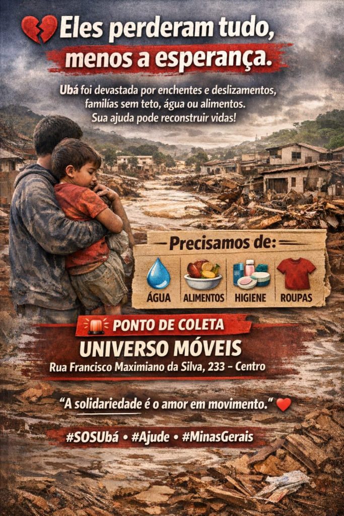 Uma campanha solidária foi iniciada para arrecadar donativos destinados às famílias atingidas pelas fortes chuvas que devastaram o município de Ubá. Enchentes e deslizamentos deixaram moradores sem teto, além de causar a perda de móveis, roupas e alimentos. Com o apelo “Eles perderam tudo, menos a esperança”, a mobilização busca sensibilizar a população para contribuir com itens essenciais. Entre as principais necessidades estão água potável, alimentos não perecíveis, produtos de higiene pessoal e roupas.