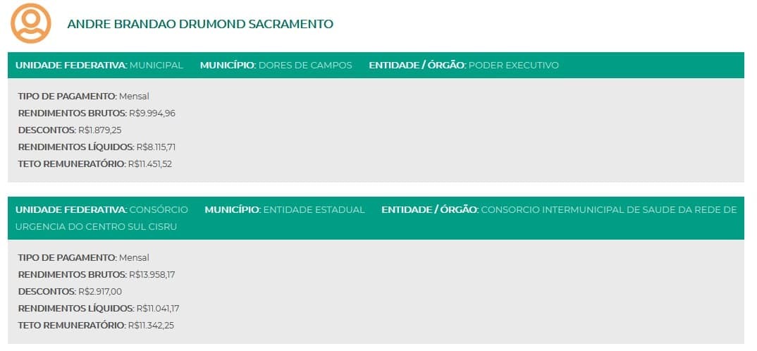 Declarações estas proferidas pelo Dr. em questão, que sabe que sua saída de nossa querida Dores de Campos é em decorrência do mesmo ter caído na “Malha Eletrônica de Fiscalização” do Tribunal de Contas do Estado de Minas Gerais. Nesta “malha” o TCE/MG acusou que o mesmo em novembro de 2017 acumulava 02 cargos; sendo um na Prefeitura Municipal de Dores de Campos, com a carga horária de 44 horas semanais e com um vencimento de R$ 11.451,52 e outro no Consórcio Intermunicipal de Saúde da Rede de Urgência do Centro Sul – CISRU, com a carga horária de 40 horas semanais e com um vencimento de R$ 11.342,25. Ou seja, como se trabalha 84 horas semanais??