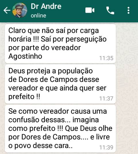 O vereador Agostinho da Darci (DEM) voltou a dizer que é pré-candidato a prefeito na eleição de 2020 e que vai denunciar o doutor André no Tribunal de Contas (TCE/MG) para que ele devolva os pagamentos que recebeu de forma irregular em Dores de Campos. “Vou protocolar a denuncia pessoalmente em Belo Horizonte. E se o TCE achar que deve, quero que o médico devolva cada centavo que recebeu da Prefeitura”, finalizou.
