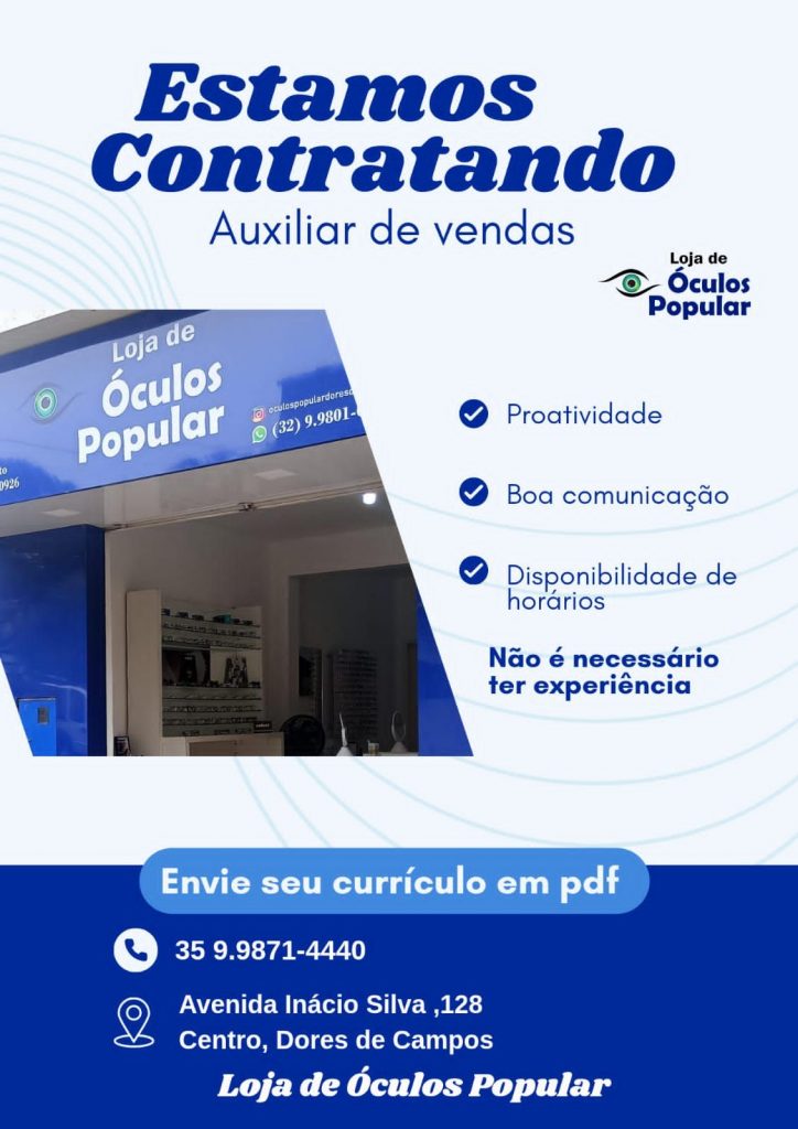 A Loja de Óculos Popular está com oportunidade de emprego aberta para o cargo de auxiliar de vendas em Dores de Campos. A vaga é destinada a candidatos com perfil proativo, boa comunicação e disponibilidade de horários. Não é necessário ter experiência, o que amplia as chances para quem busca o primeiro emprego ou recolocação no mercado.