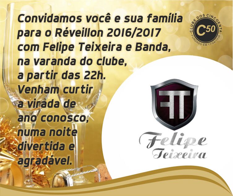 O Clube dos Cincoenta espera por você e sua família no Réveillon 2017, que será realizado no “varandão” do Clube, a partir das 10 horas da noite, com um super show de Felipe Teixeira e Banda. Venha receber o ano novo de braços abertos, com muita alegria. Outras informações pelos telefones (32) 3353 1308 ou (32) 99976 1308.