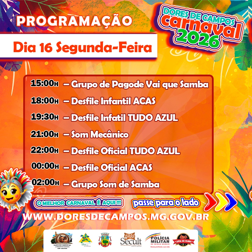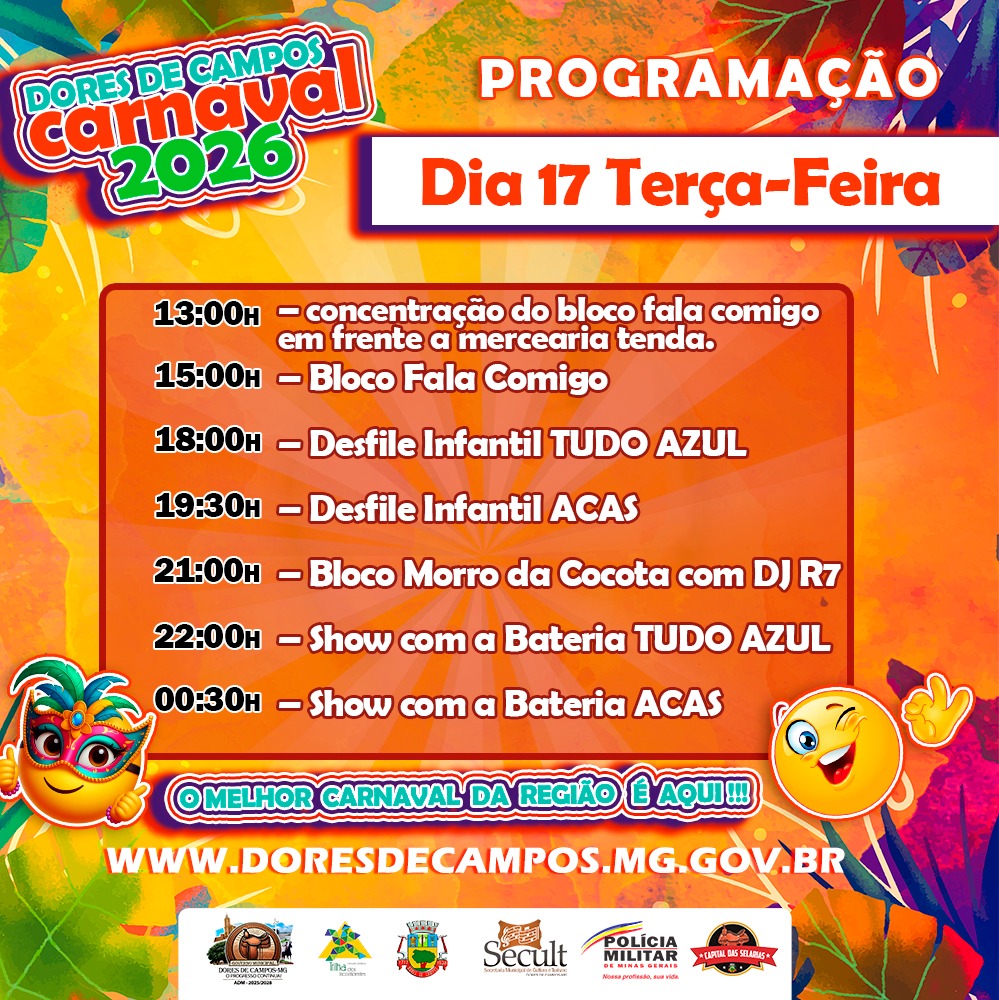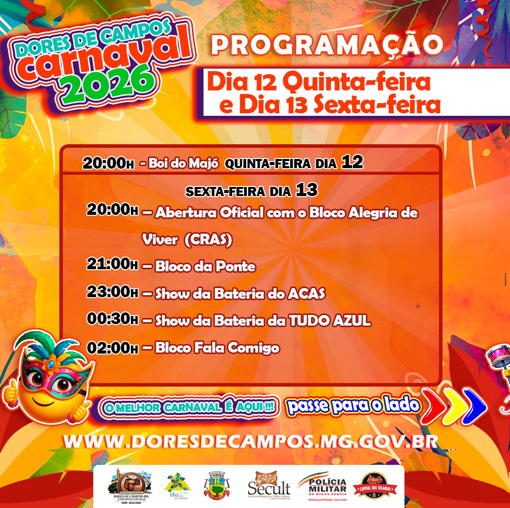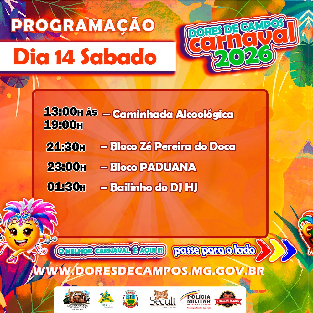 A Prefeitura Municipal de Dores de Campos anunciou a programação completa do Carnaval 2026. A festa contará com desfiles de escolas de samba, blocos carnavalescos, atrações musicais e atividades para todas as idades. Segundo a administração municipal, a organização priorizou a valorização da cultura dorense, a segurança dos foliões e o fortalecimento do comércio e do turismo.