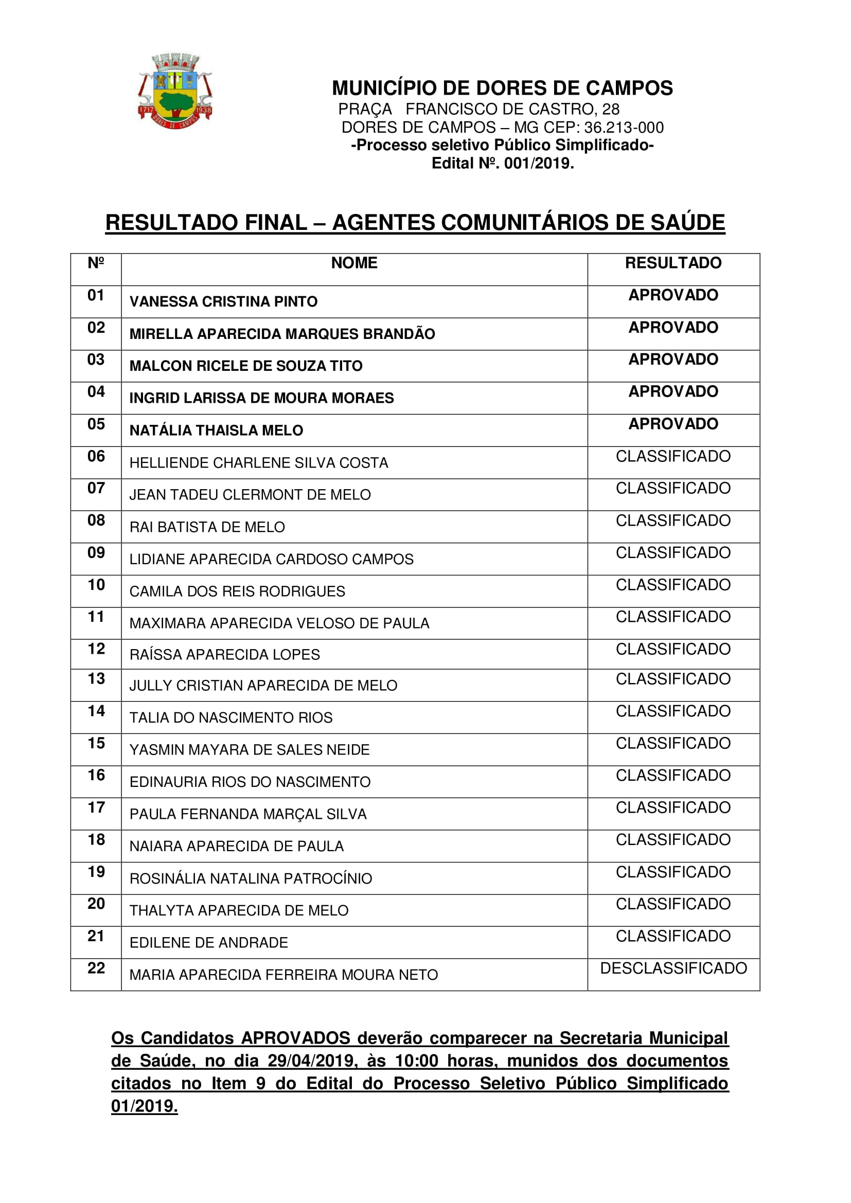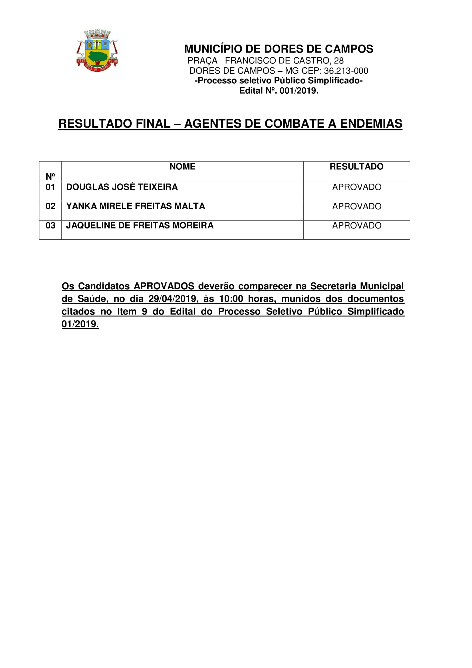 A Prefeitura de Dores de Campos, através da Secretaria Municipal de Saúde, publicou o resultado final do Processo Seletivo Simplificado 01/2019, com cinco vagas para Agentes Comunitários de Saúde e cinco vagas para Agentes de Combate a Endemias, todos com salário de R$ 1.250,00. A Prefeitura também está convocando todos os aprovados para comparecerem às dez horas da manhã desta segunda-feira (29) na sede da Secretaria Municipal de Saúde na praça do Rosário, com todos os documentos obrigatórios, conforme o item 9 do Edital.