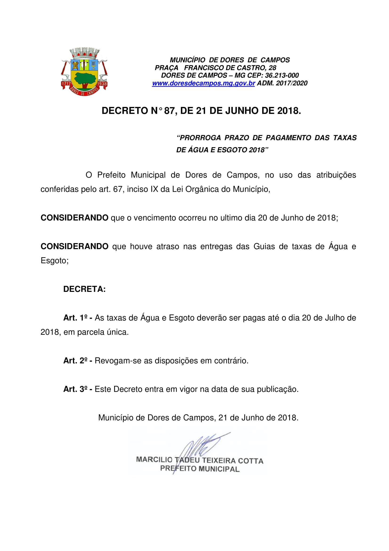A Prefeitura Municipal de Dores de Campos informa que o vencimento da Taxa de Água e Esgoto 2018 foi prorrogado para o próximo dia 20 de julho (Sexta-feira), conforme o Decreto de número 87/2018, assinado pelo prefeito Marcílio Cotta (MDB). Desta forma, os dorenses ganham mais 30 dias para quitar este importante tributo no valor anual de R$ 50,00. Para outras informações procure o Setor de Tributação no prédio da Prefeitura ou ligue no telefone (32) 3353 2446.