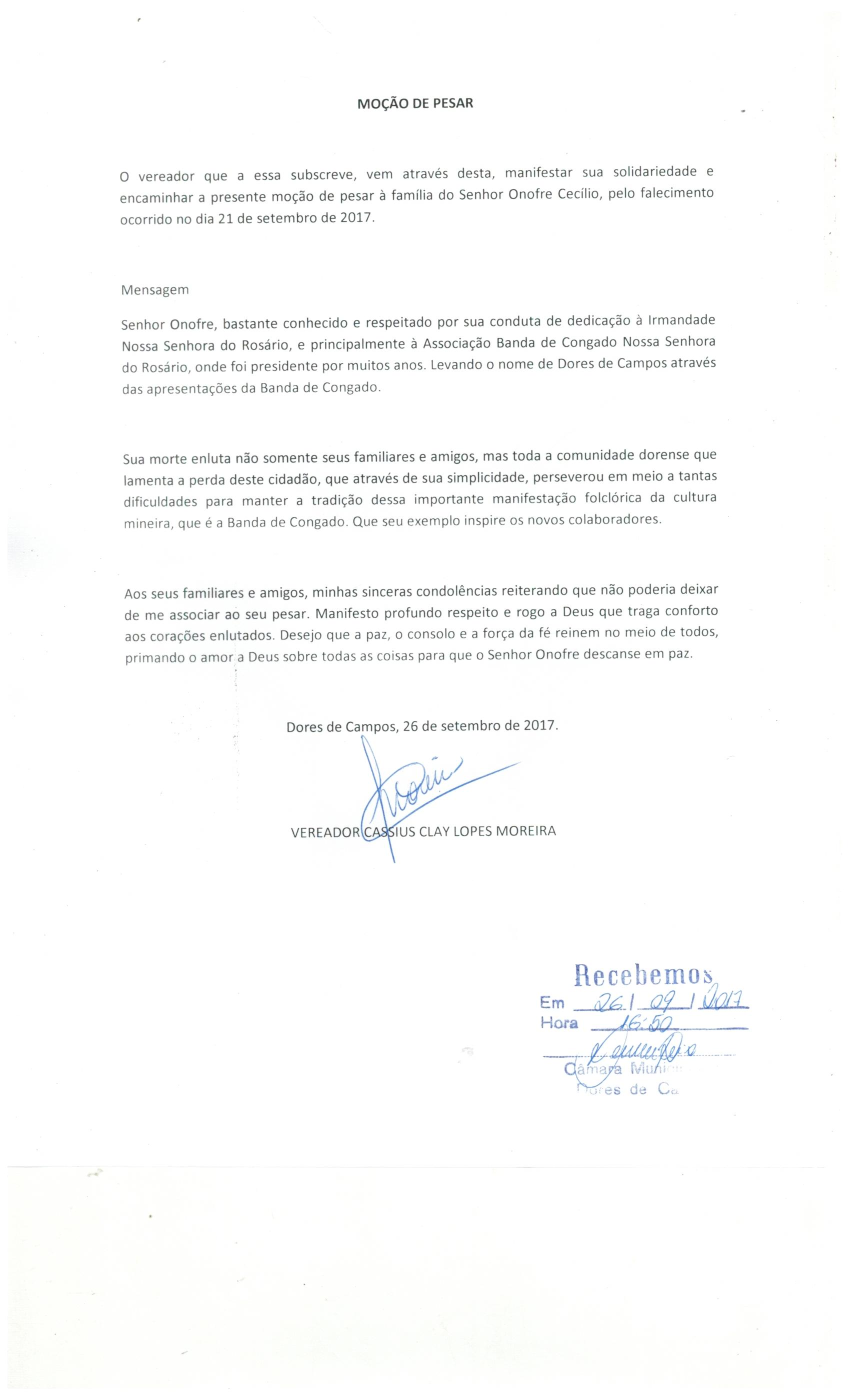 O vereador Cássius do Totinho (PMDB) apresentou no Plenário da Câmara Municipal durante a reunião da última terça-feira (27/09), uma “Moção de Pesar” pelo falecimento do senhor Onofre Cecílio, diante da sua importância na Irmandade de Nossa Senhora do Rosário, assim como no resgate da Banda de Congado.