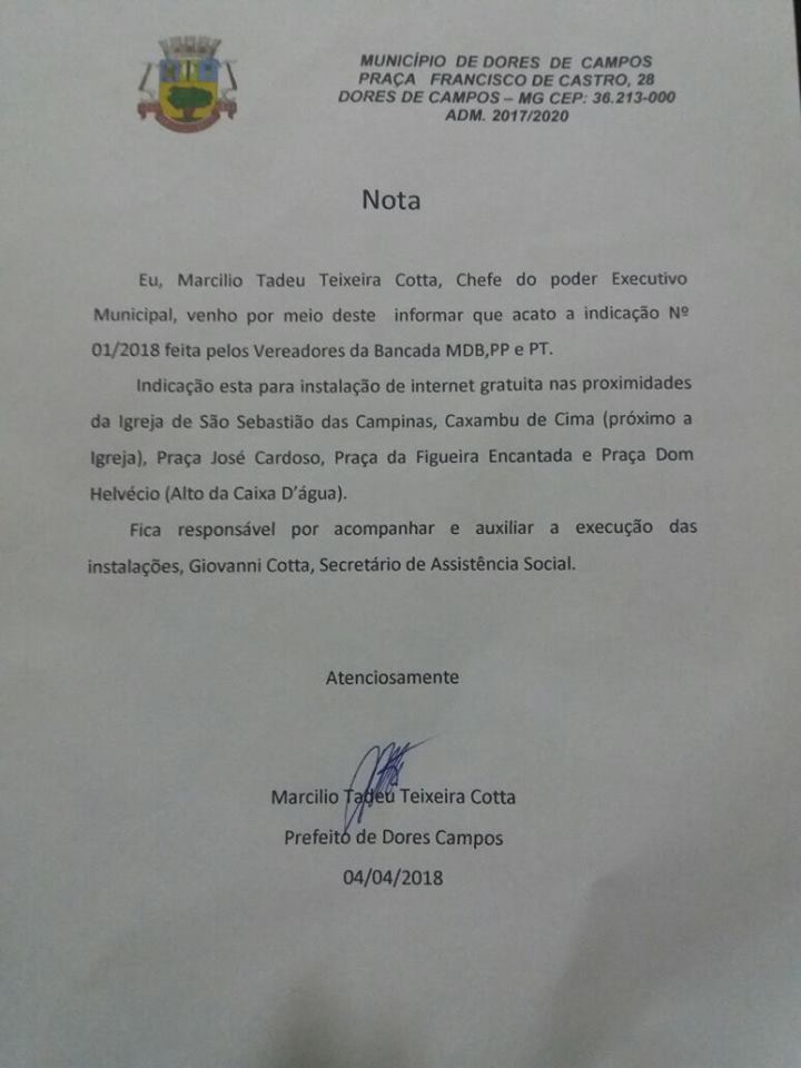 Atendendo uma Indicação dos vereadores da bancada de situação na Câmara Municipal de Dores de Campos, Bal do Carlos Heleno (PT), Cimerco (PP), Olinto (PP), Cássius do Totinho (MDB) e Soninha do Caxambu (MDB), a atual administração já começou a instalação dos pontos gratuitos de internet em diversas praças do município, dentro do “Programa Praça Digital”. Conforme o prefeito Marcílio Cotta (MDB) confirmou, a internet já está funcionando nas praças José Cardoso na região Central, e também na praça Dom Helvécio no bairro Alto da Caixa D´Água. Nos próximos dias, os outros locais indicados pela bancada do MDB, PP e PT também terão o serviço disponibilizado.