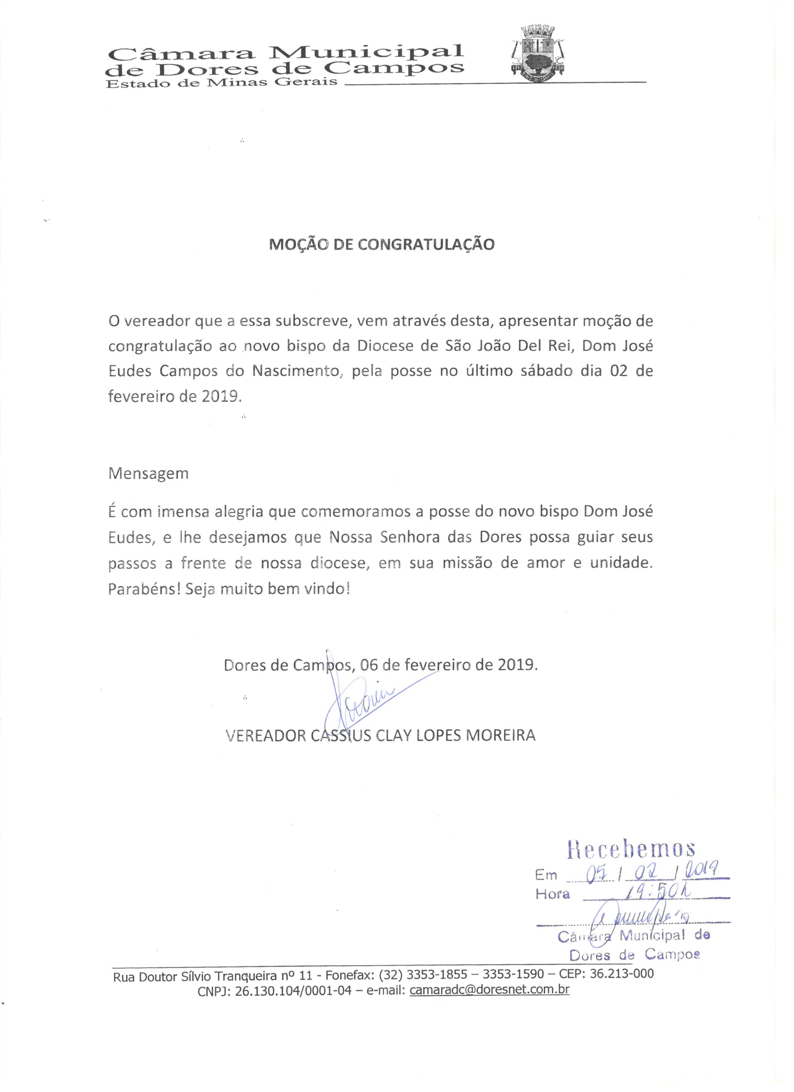 Na oportunidade, o vereador Cássius do Totinho (MDB) entregou ao bispo a Moção de Congratulação de sua autoria, que já havia sido apresentada no Plenário da Câmara.