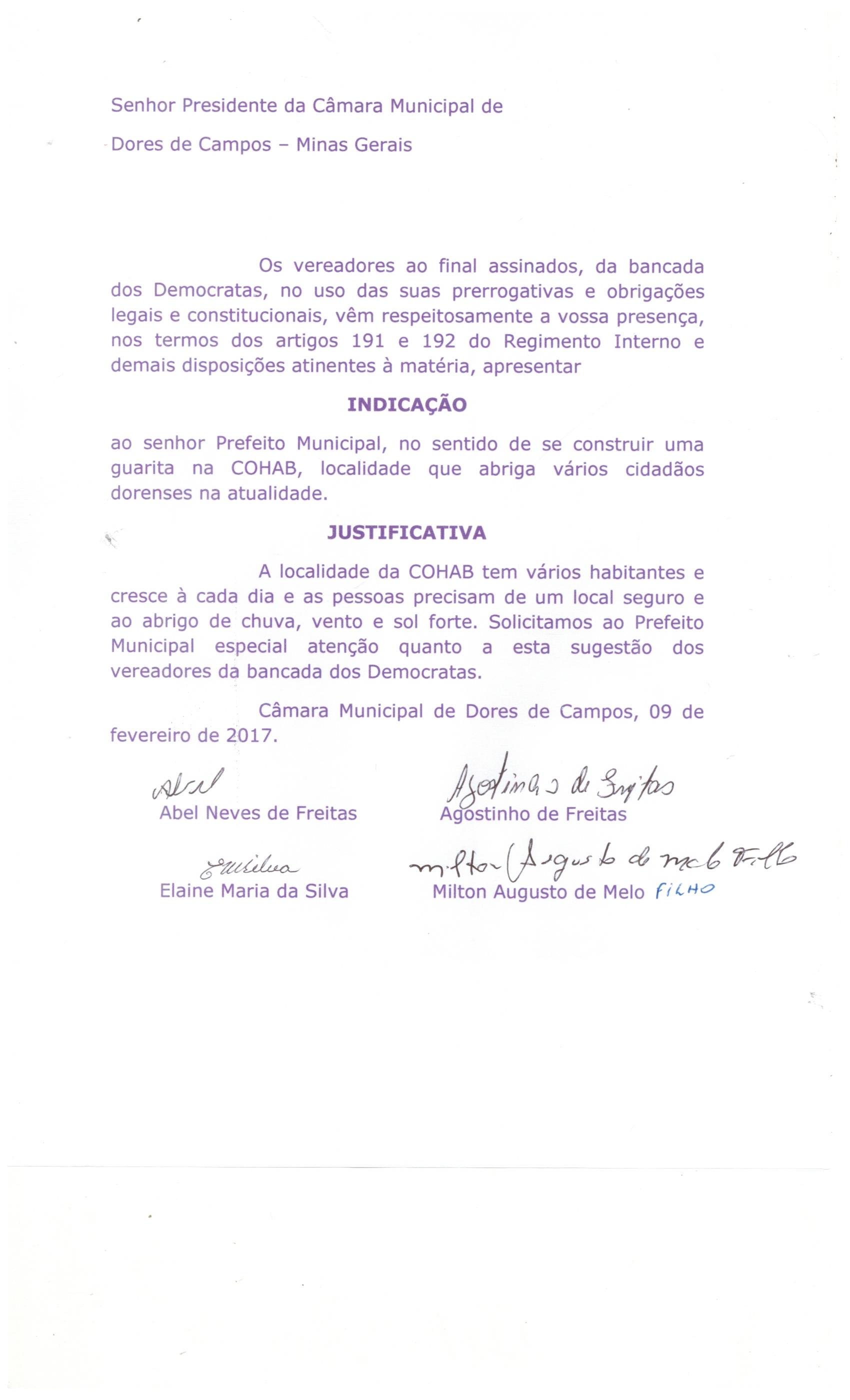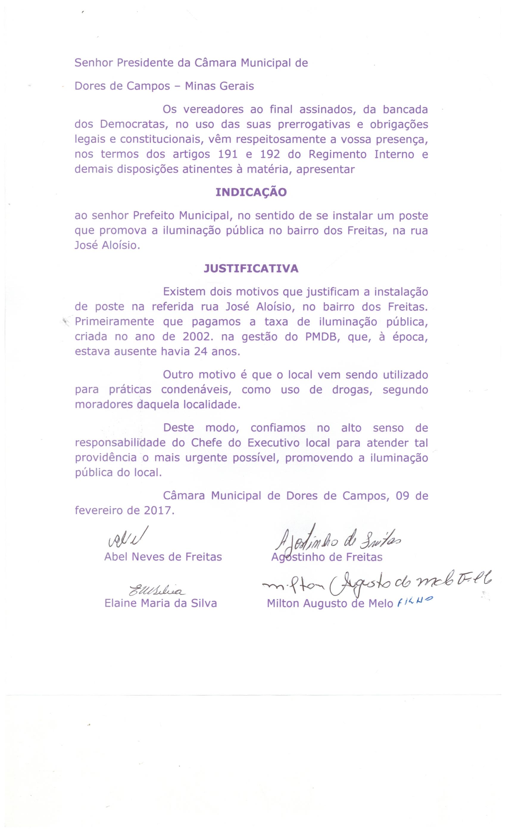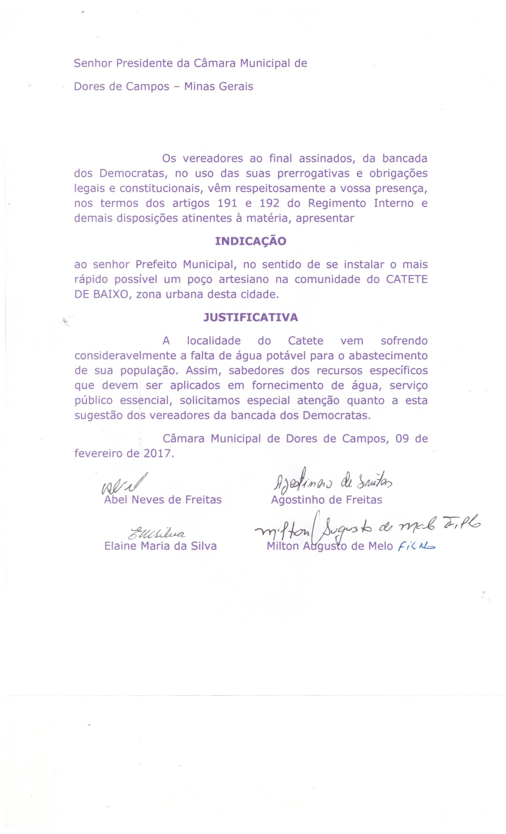 O líder dos Democratas, vereador Agostinho da Darci (DEM), enfatizou que a sua bancada já havia definido que irá apresentar Indicações em praticamente todas as Sessões, formalizando assim as suas solicitações. O vereador também disse que a Taxa de Iluminação Pública foi criada no ano de 2002, durante a gestão do PMDB. O Democrata ressaltou ainda, que o Poço Artesiano indicado pela bancada é para o Caxambu de Baixo, e a vereadora Soninha (PMDB) pediu o benefício para o Caxambu de Cima.