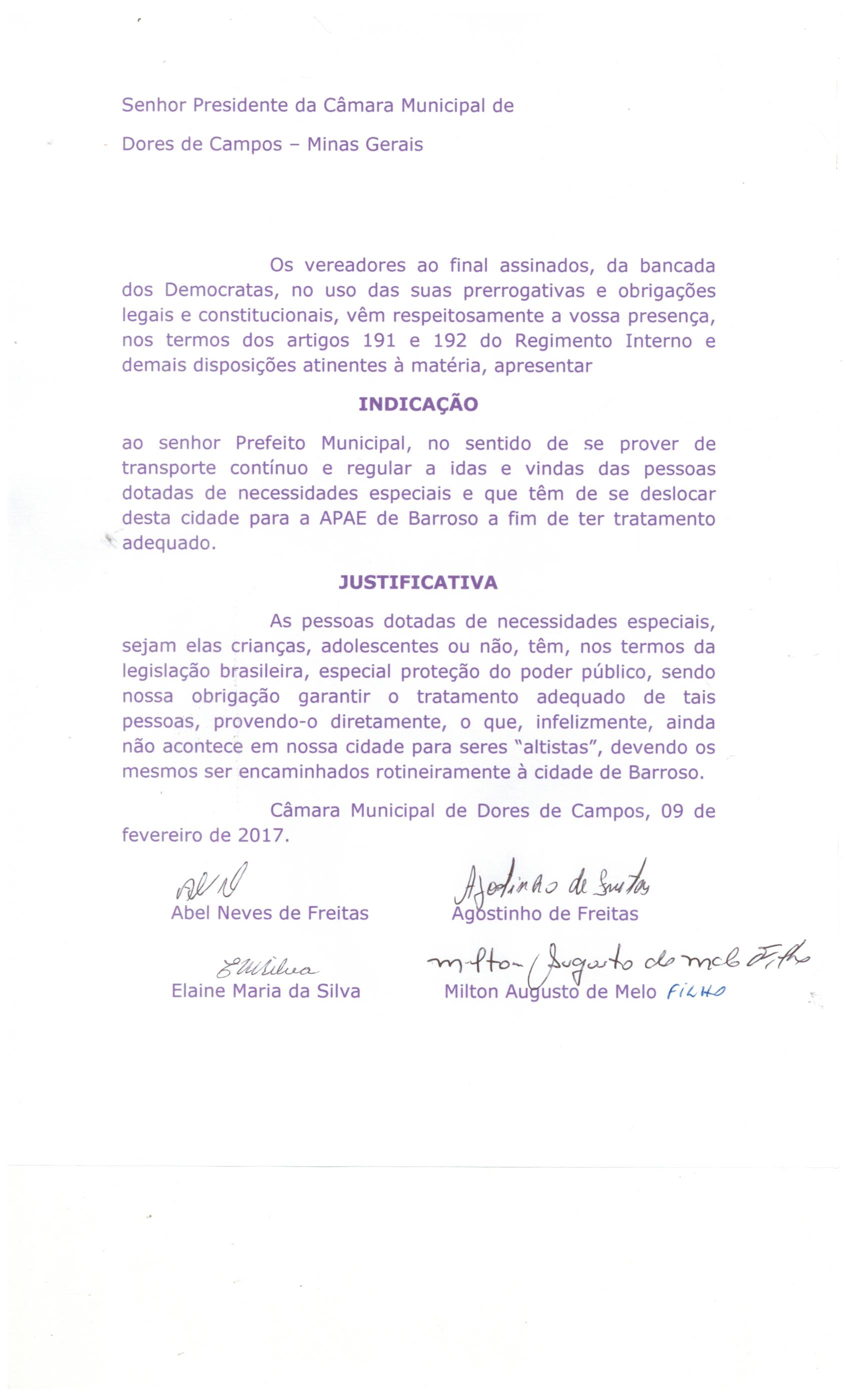 Os vereadores da bancada dos Democratas apresentaram cinco Indicações ao prefeito Marcílio Cotta (PMDB) e na oportunidade, o Líder do Executivo na Casa, vereador Olinto (PP), destacou que a maioria das solicitações já estão sendo colocadas em prática pela atual administração, como a busca de recursos para a construção dos Poços Artesianos no Catete e no Caxambu, além da reativação do transporte gratuito para os alunos que estudam na APAE de Barroso, que de acordo com o vereador, havia sido suspenso pela administração passada, gerando um custo aproximado de R$ 400,00 por mês para cada família.