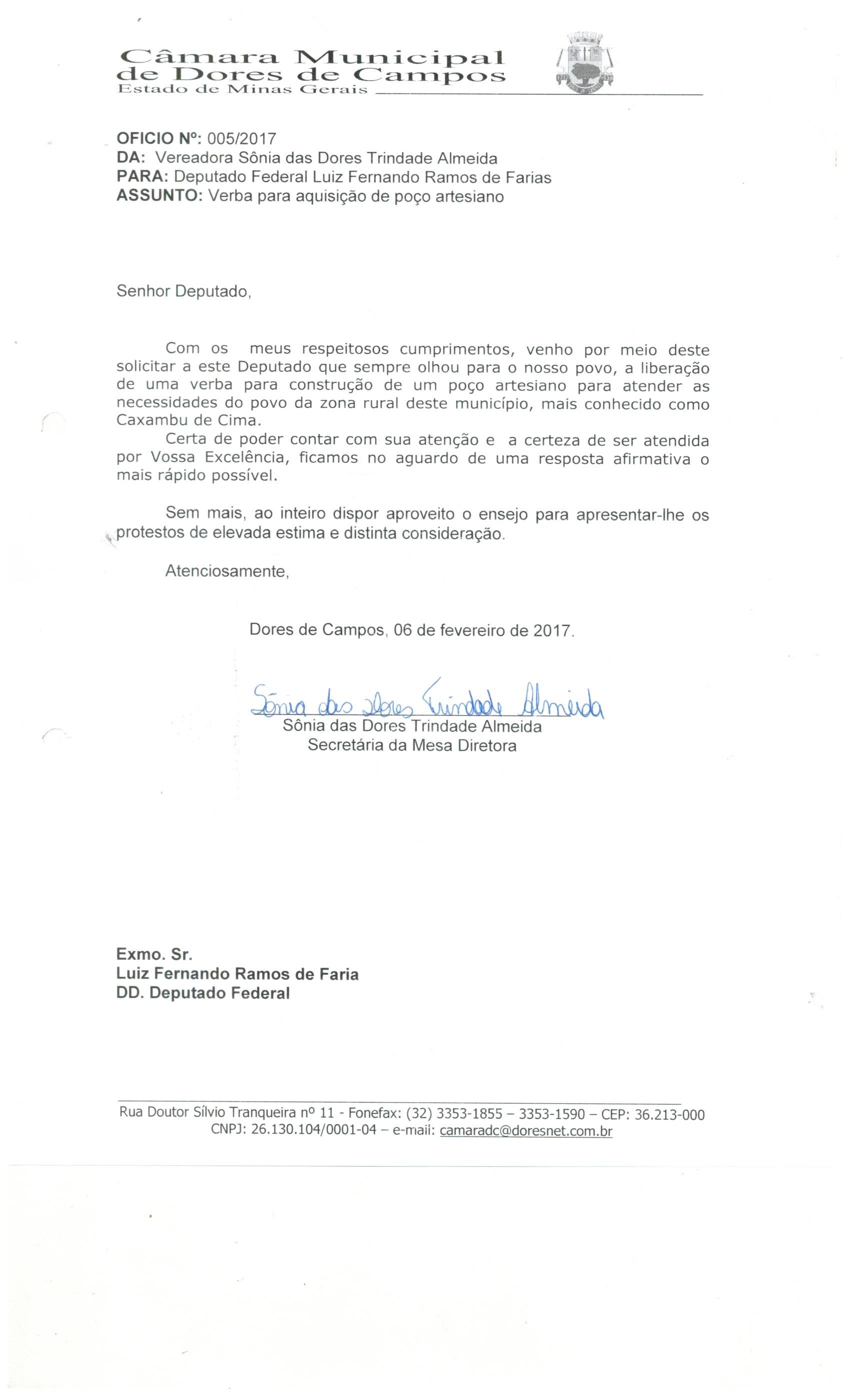 A vereadora Soninha do Caxambu (PMDB) comentou sobre um ofício enviado ao deputado federal Luiz Fernando (PP) no início deste semana, onde o parlamentar se comprometeu a trabalhar na liberação de recursos para as obras do Poço Artesiano no Caxambu de Cima. O presidente da Câmara, vereador Bal do Carlos Heleno (PT), confirmou que há 15 dias, participou de uma reunião com o prefeito Marcílio (PMDB), com o deputado estadual Cristiano Silveira (PT) e com o deputado federal Reginaldo Lopes (PT) na busca de verba para o Posto Artesiano do Catete, inclusive com a apresentação do projeto da obra.