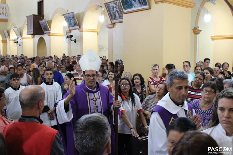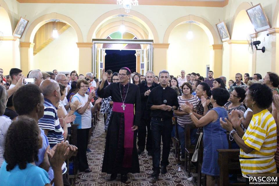 Recém empossado como novo bispo da Diocese de São João Del Rei, dom José Eudes Campos do Nascimento realizou na noite desta quinta-feira (14) a sua primeira visita oficial a Paróquia de Nossa Senhora das Dores. O religioso foi recepcionado pelo padre Paulo Marcelo, em companhia do prefeito Marcílio Cotta (MDB), do vice-prefeito Aguinaldo do Lado (MDB) e da presidente da Câmara Municipal, vereadora Soninha do Caxambu (MDB). Todos os movimentos da Paróquia também se fizeram representados e a secretária municipal de educação, Sirlene Aliane, leu um texto de boas vindas ao bispo, que agradeceu a acolhida dos dorenses.